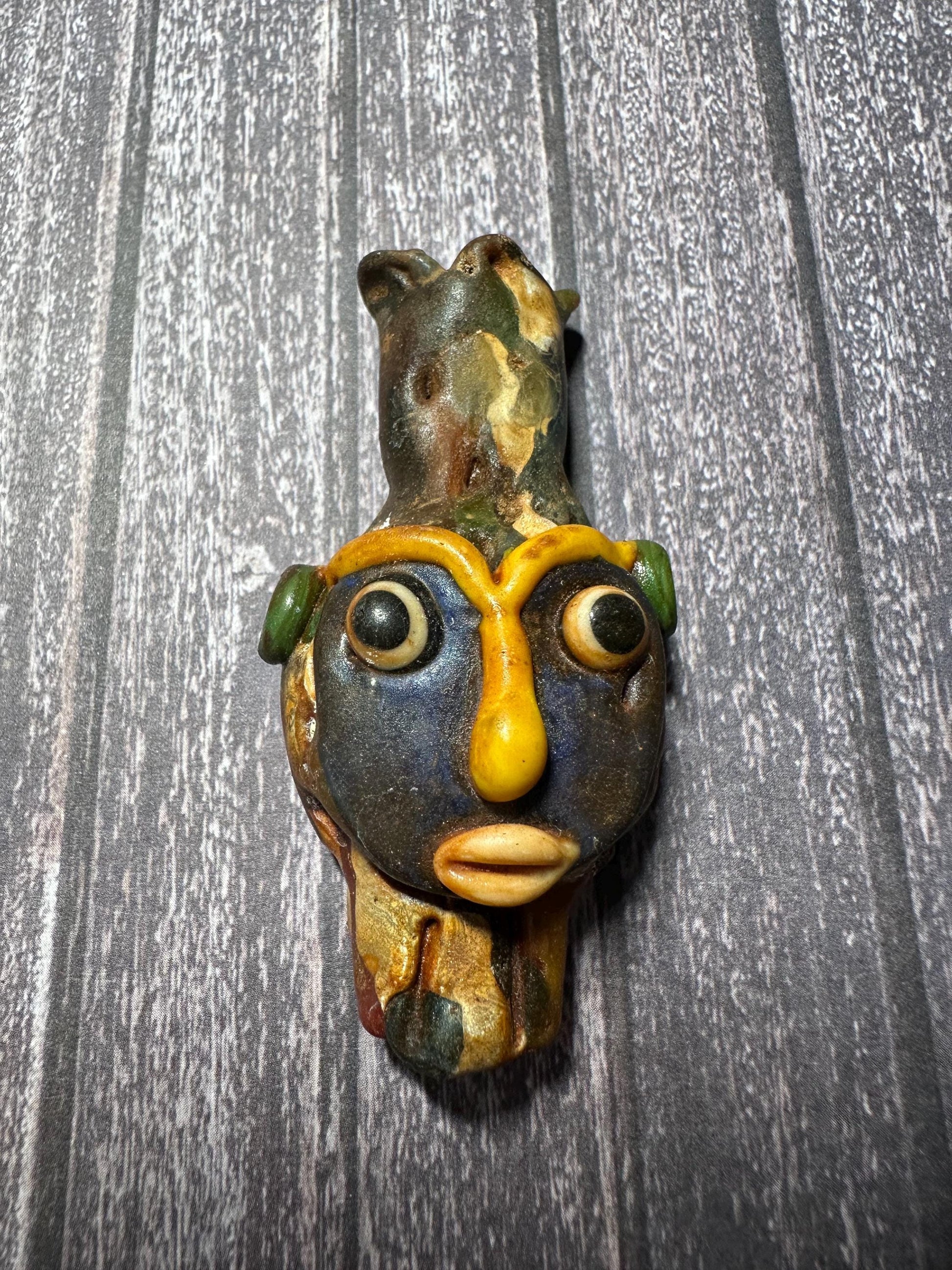 This unique pendant can serve as a remarkable collectible or a statement piece in jewelry design. Its detailed facial features and bold colors make it a testament to the artistry of ancient civilizations.