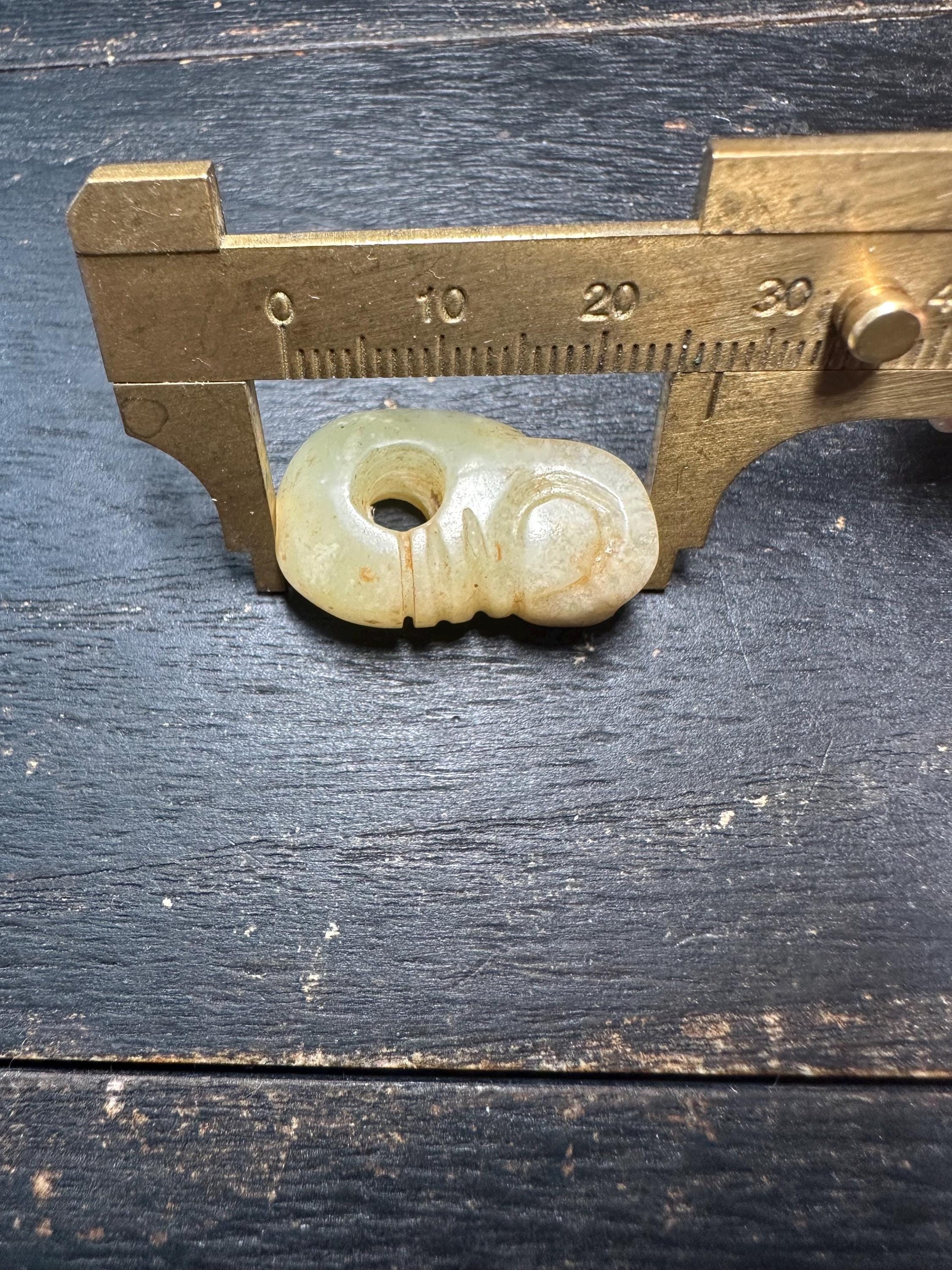 The jade has a natural pale green hue with visible age-related inclusions and patina, giving it an authentic weathered feel.