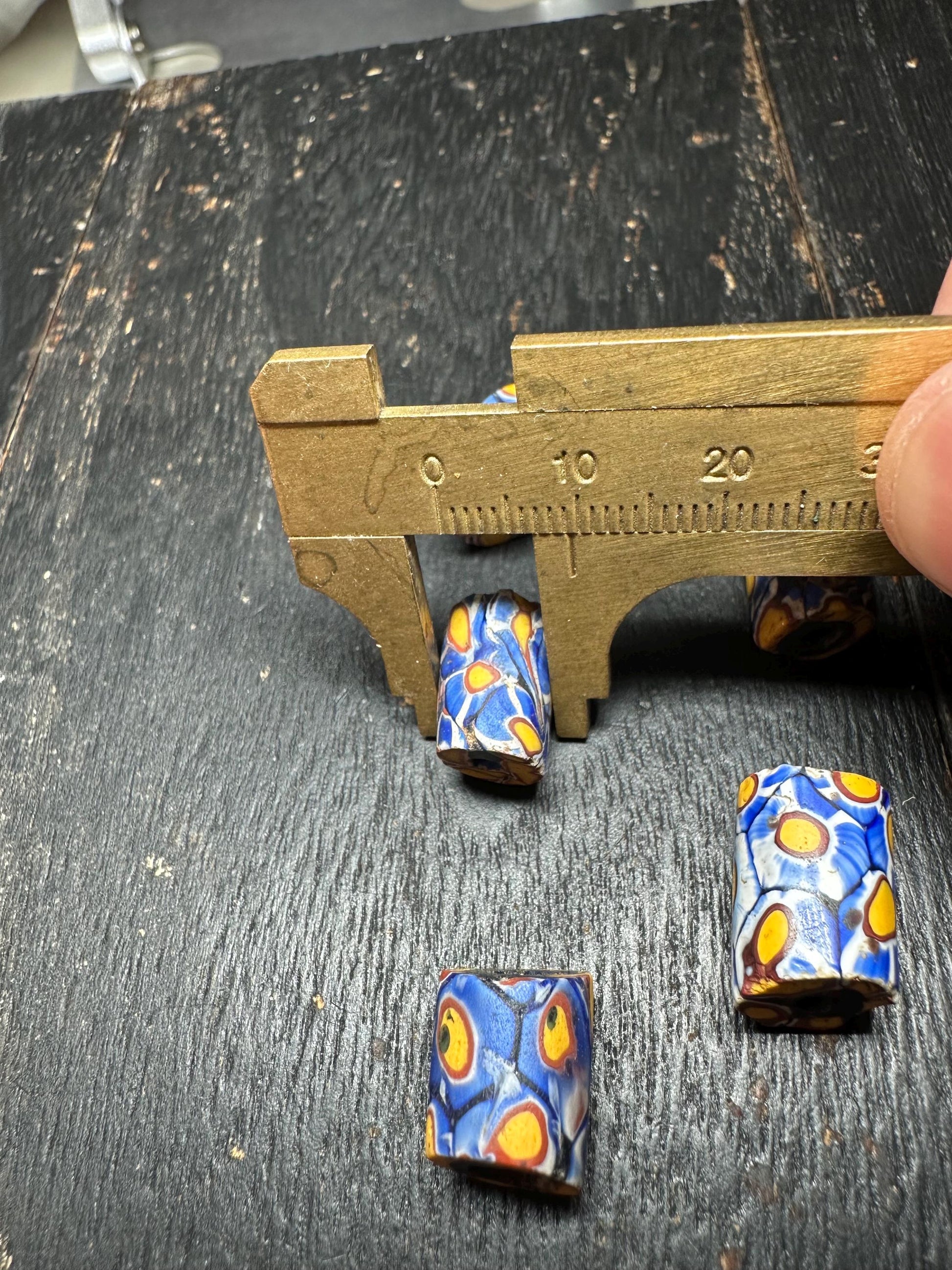 Add a touch of global history to your jewelry with these stunning Antique Millefiori Glass Beads, handcrafted in Venice and once traded across Africa in the 19th to early 20th centuries. Each bead is a unique work of art, featuring vibrant mosaic patterns in blues, yellows, and white— a true testament to the Millefiori (“thousand flowers”) glassmaking technique.