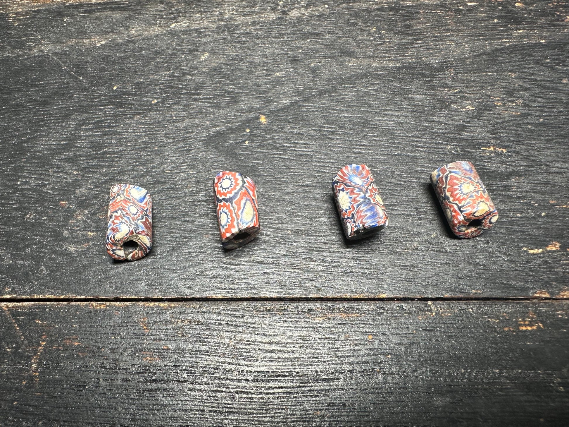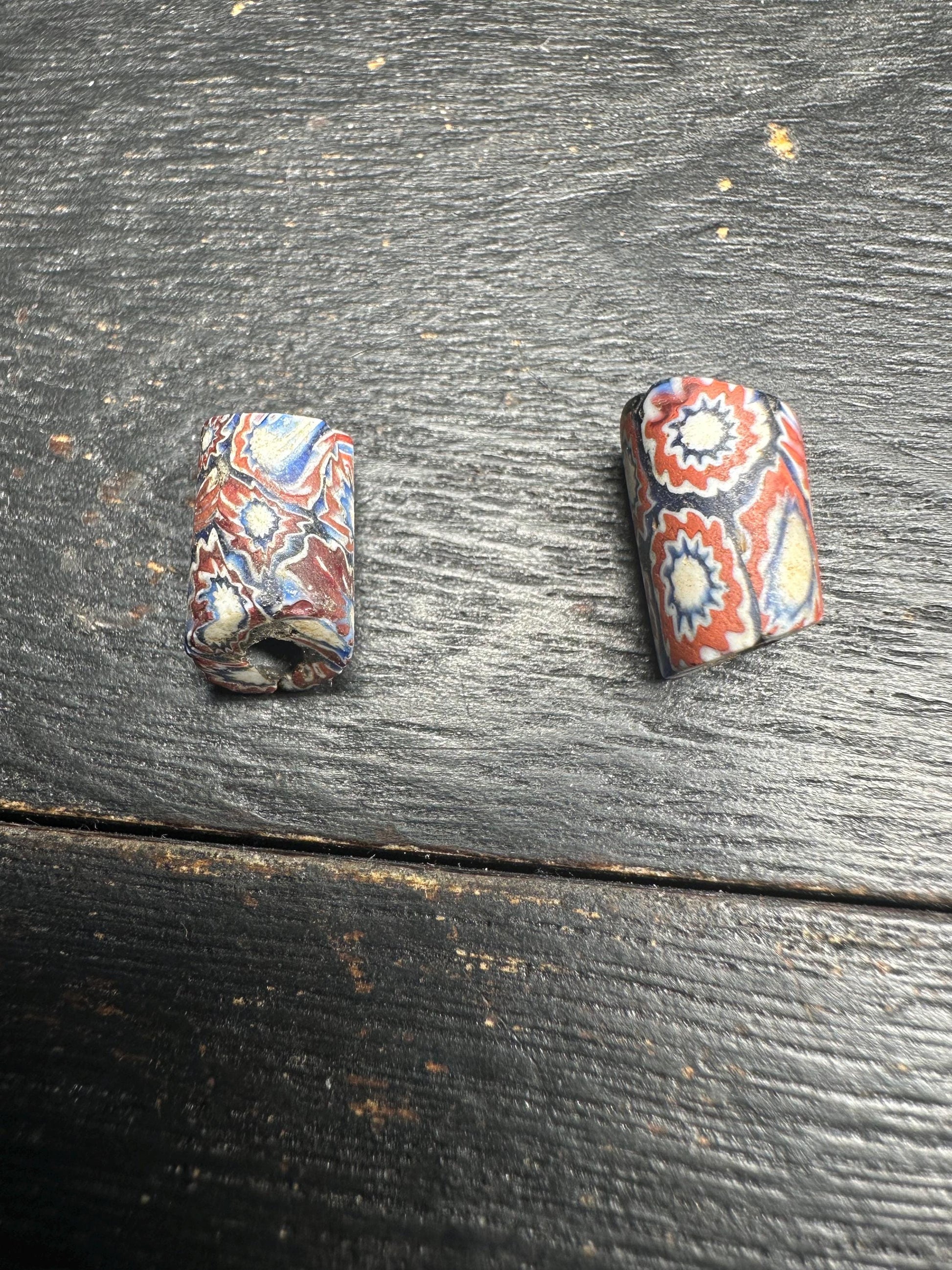 Add a touch of global history to your jewelry with these stunning Antique Millefiori Glass Beads, handcrafted in Venice and once traded across Africa in the 19th to early 20th centuries. Each bead is a unique work of art, featuring vibrant mosaic patterns in rich reds, blues, and whote— a true testament to the Millefiori (“thousand flowers”) glassmaking technique.