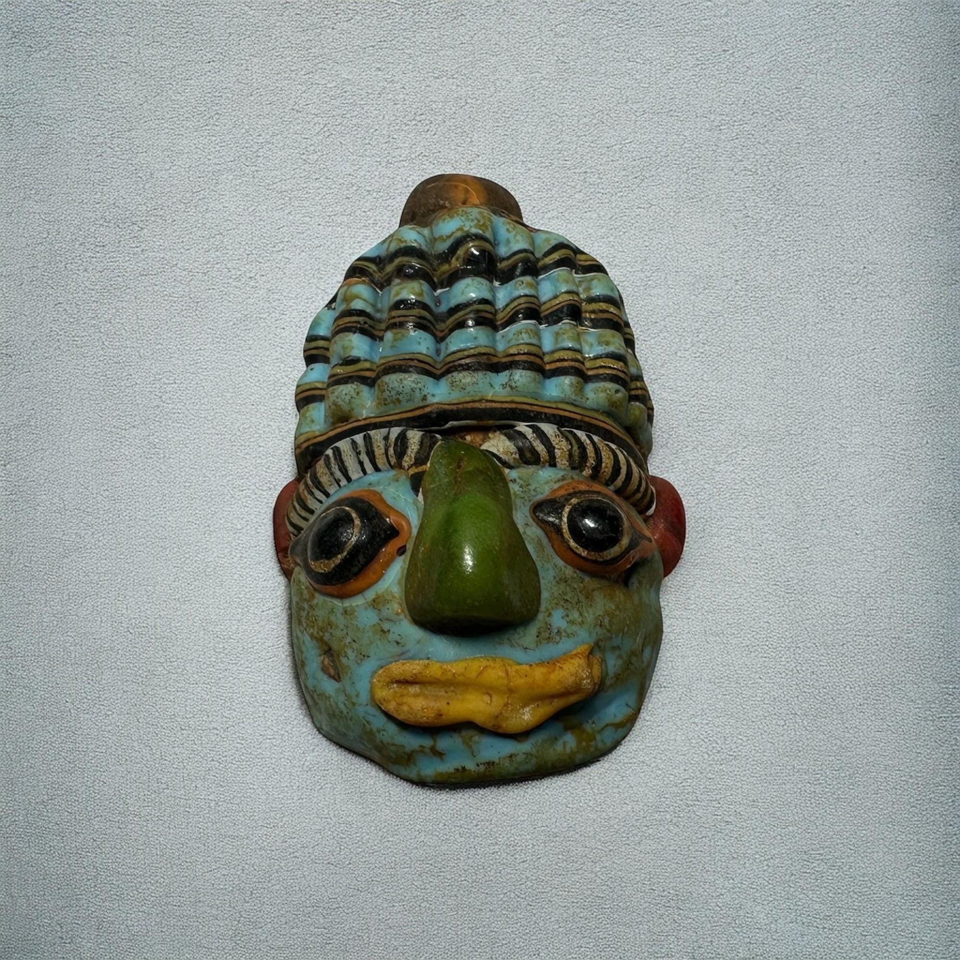 This unique pendant can serve as a remarkable collectible or a statement piece in jewelry design. Its detailed facial features and bold colors make it a testament to the artistry of ancient civilizations.