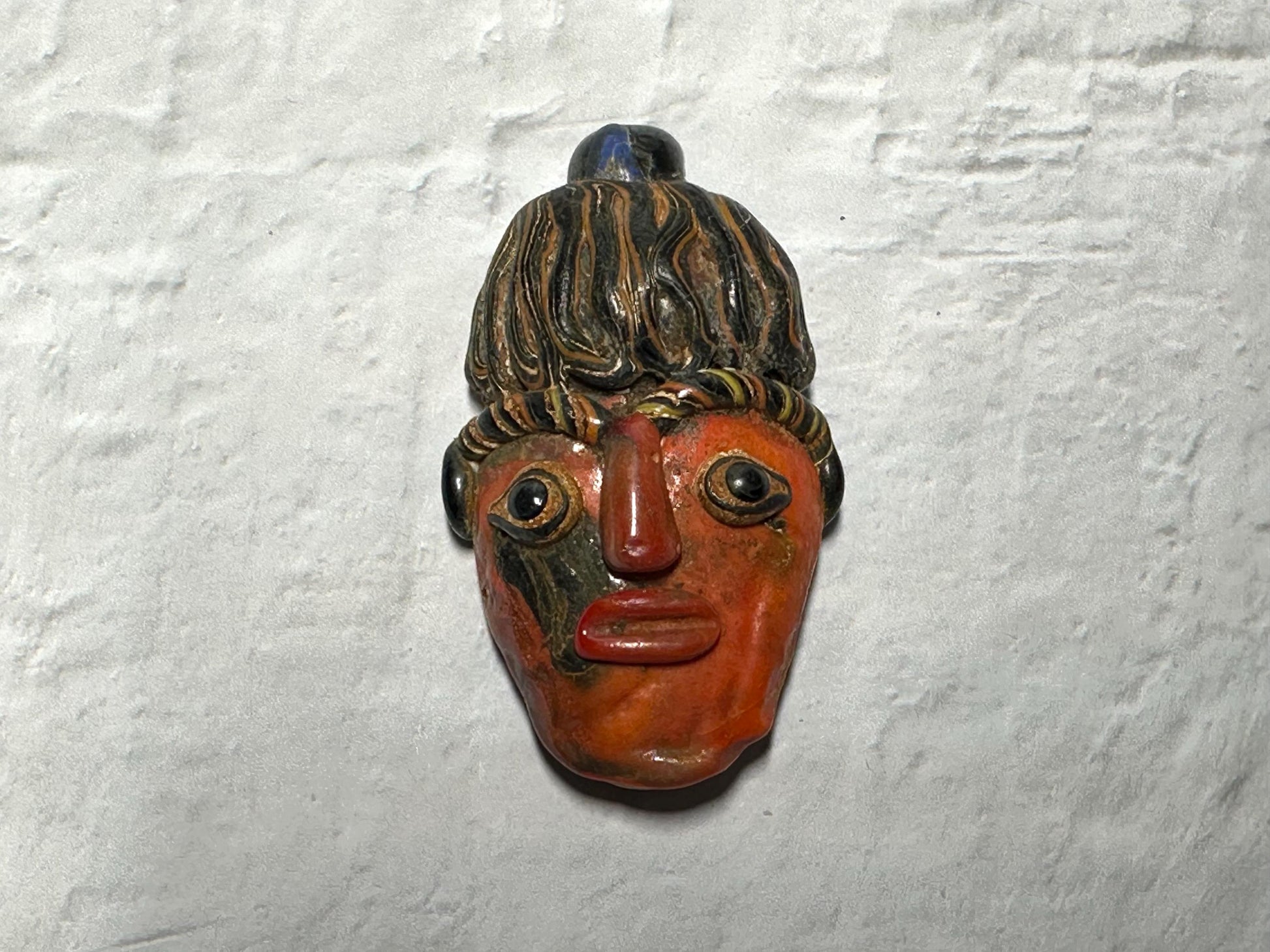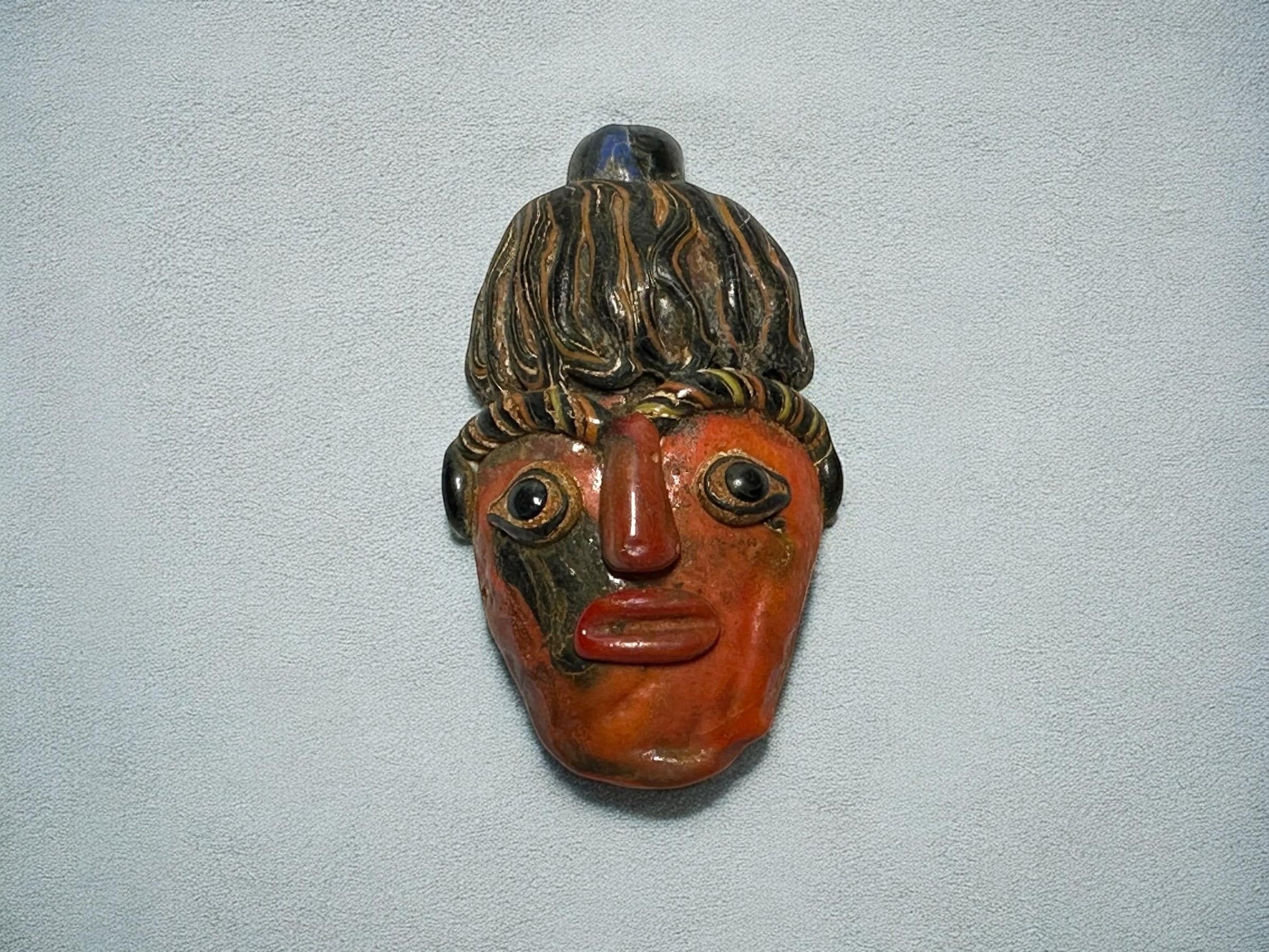 This unique pendant can serve as a remarkable collectible or a statement piece in jewelry design. Its detailed facial features and bold colors make it a testament to the artistry of ancient civilizations.