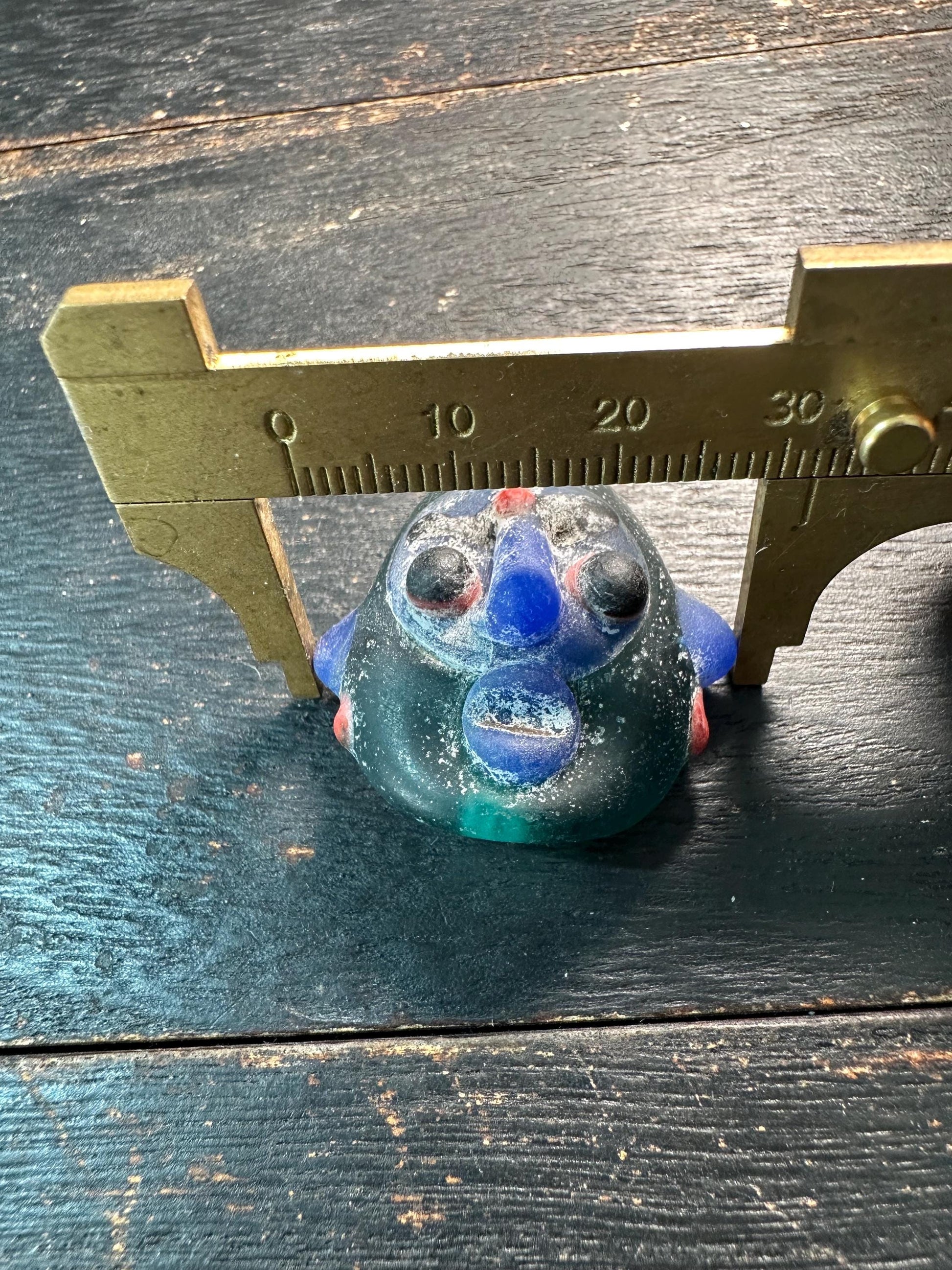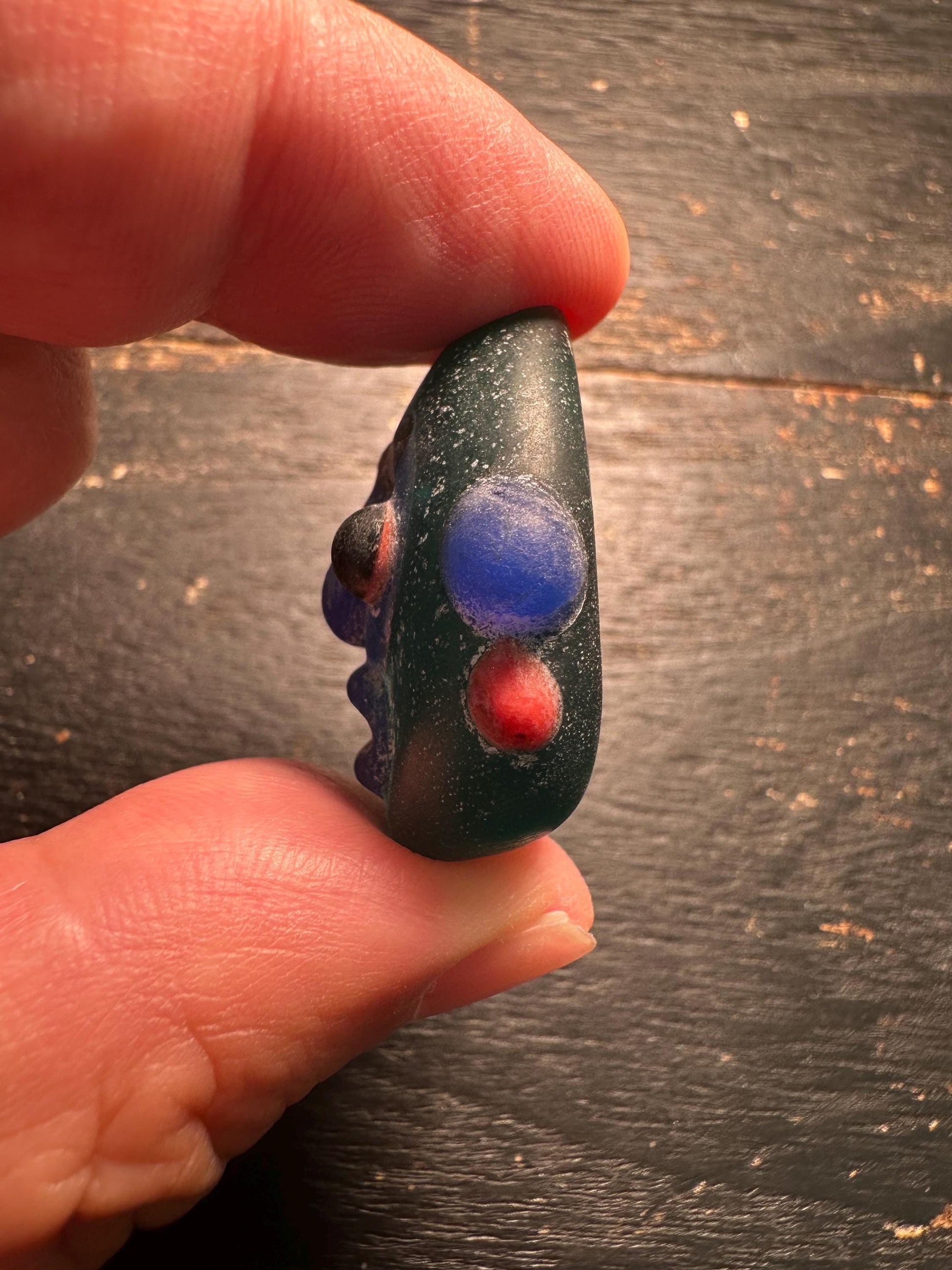Bring vibrant folk culture and unique artistry into your jewelry designs with this handcrafted face pendant made from recycled glass. Featuring a colorful tribal-style face with bold black eyes, a prominent nose, and red dot accents, each pendant is one of a kind with a playful, expressive character.