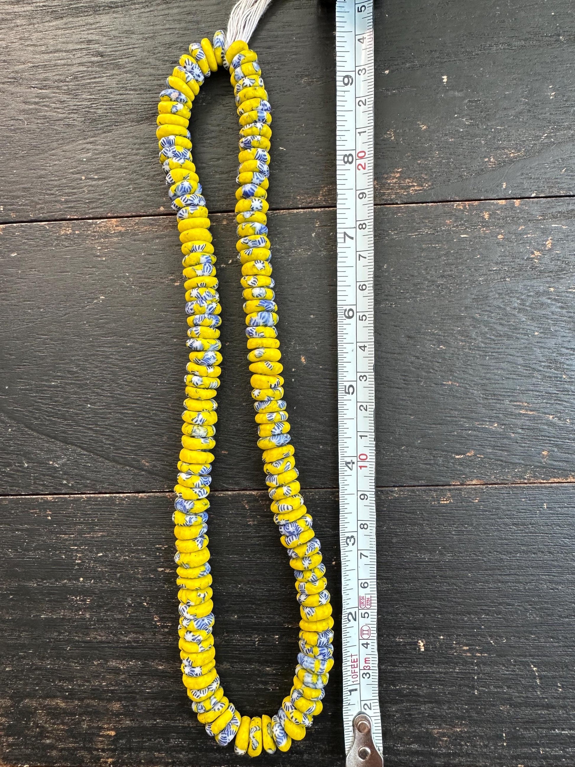 Authentic African Trade Beads Yellow Blue Fused Glass Krobo Beads from Ghana 10-11mm Spacer Beads