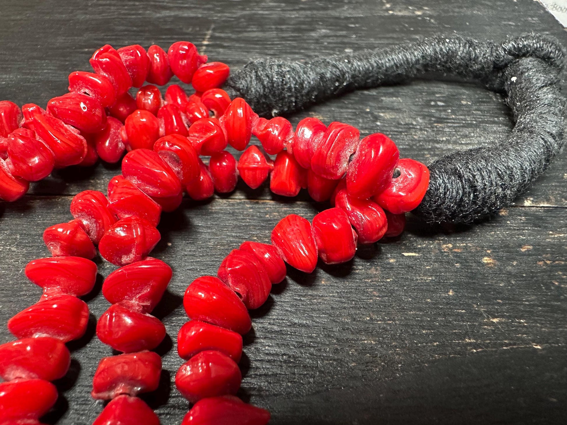 Add a bold splash of color and culture to your outfit with this eye-catching handcrafted beaded necklace. Featuring vivid red glass beads and chunky faux coral barrel-shaped beads, this layered strand design channels a rich tribal and vintage aesthetic. Finished with traditional-style black thread wrapping at the neck, it’s a statement piece perfect for lovers of ethnic, African, or boho fashion.