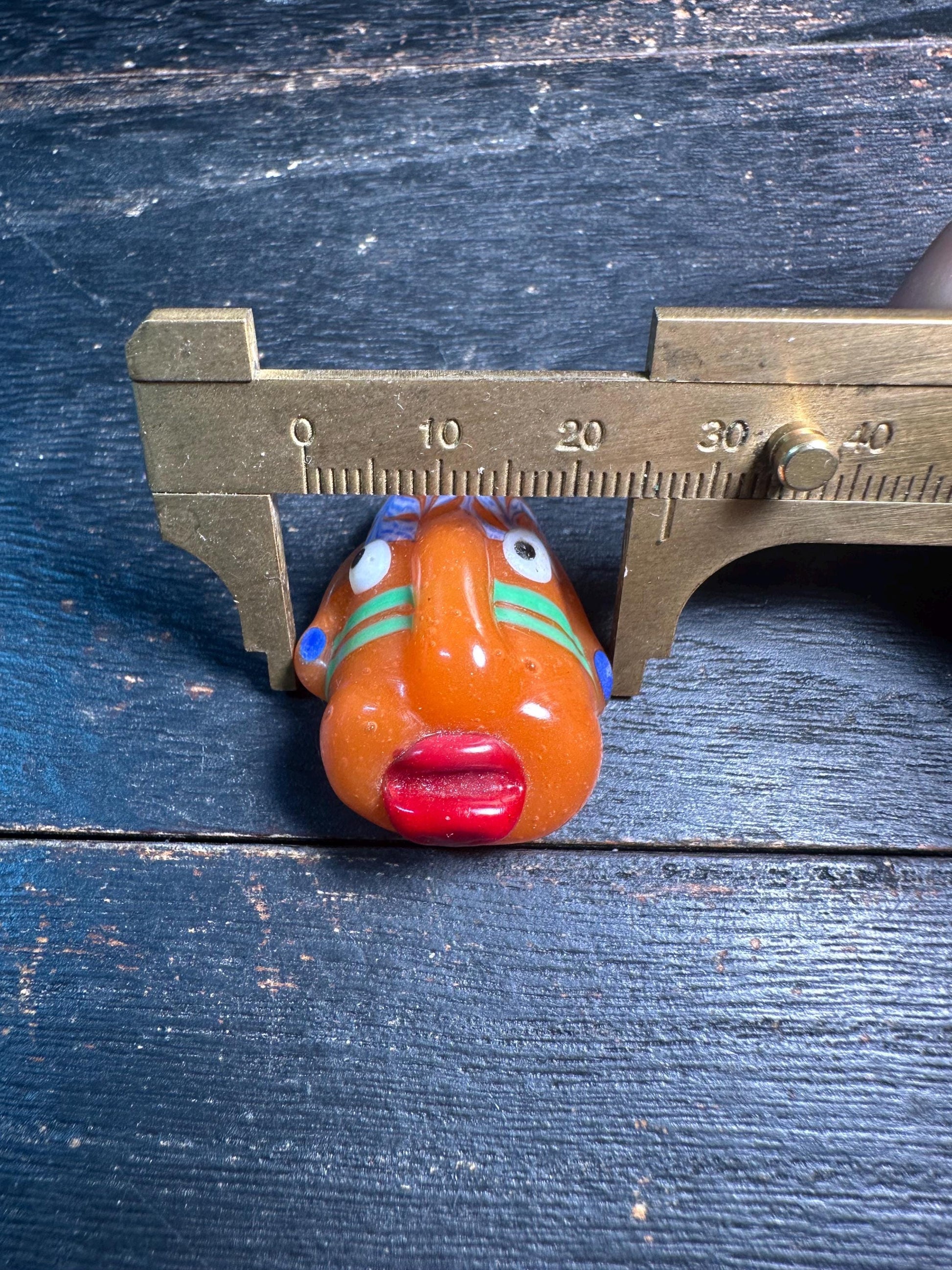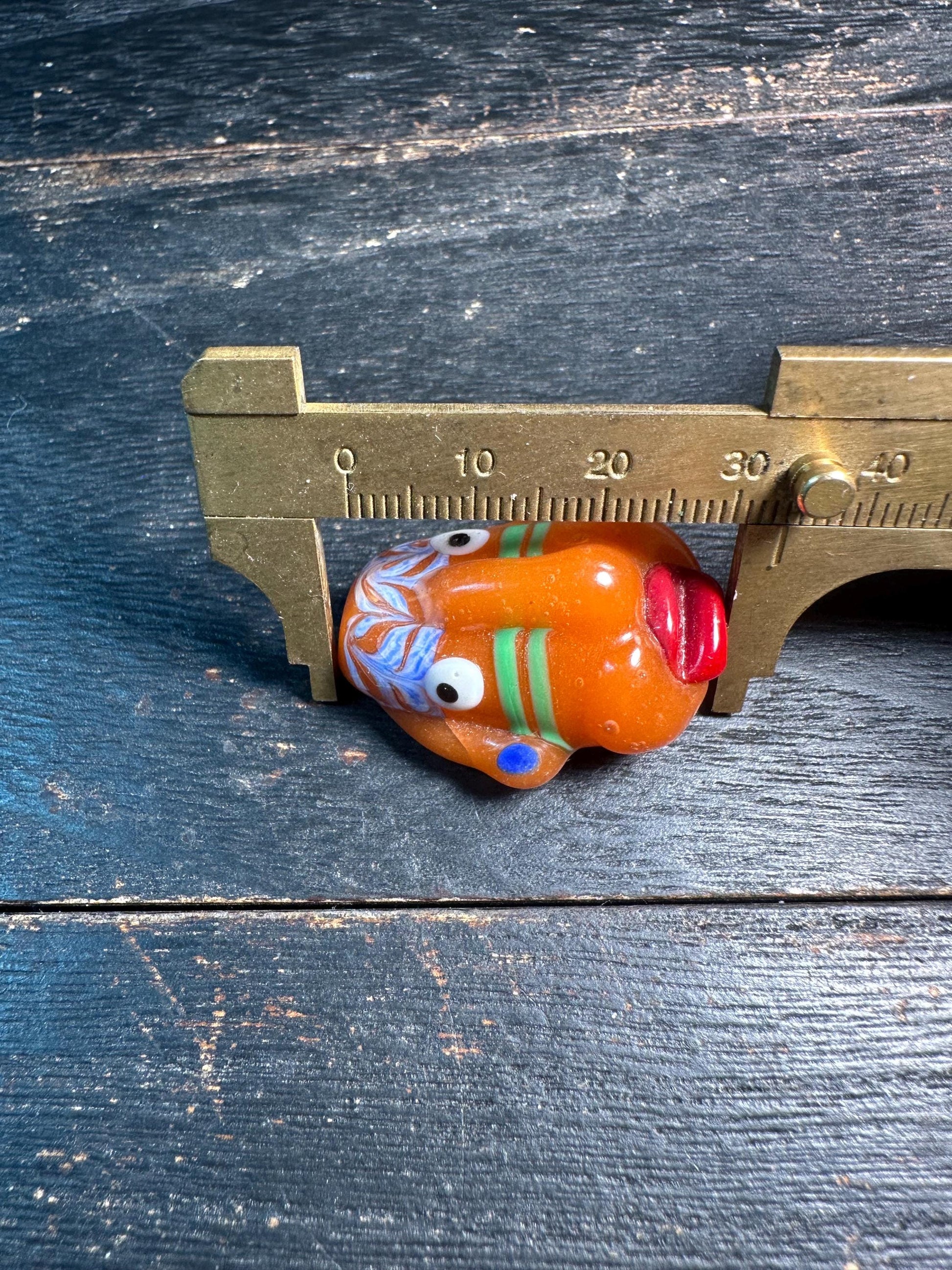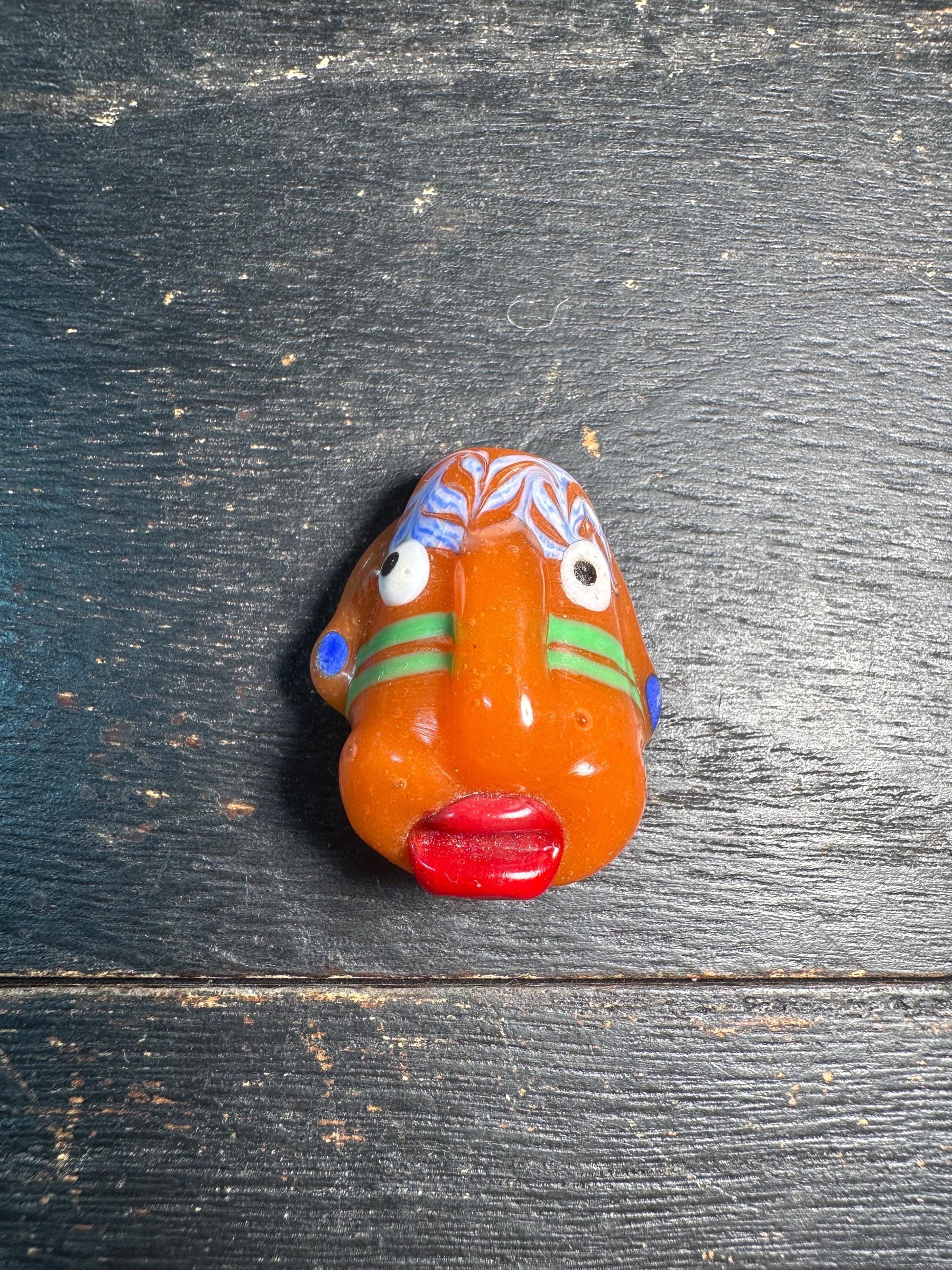Bring vibrant folk culture and unique artistry into your jewelry designs with this handcrafted face pendant made from recycled glass. Featuring a colorful tribal-style face with bold black eyes, a prominent nose, and blue dot accents, each pendant is one of a kind with a playful, expressive character.