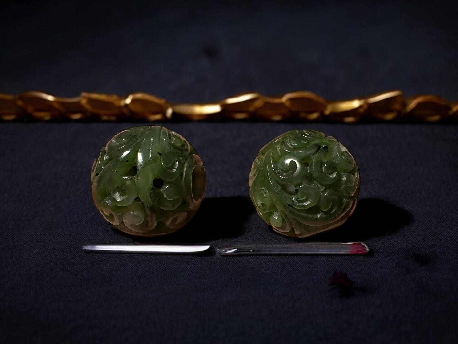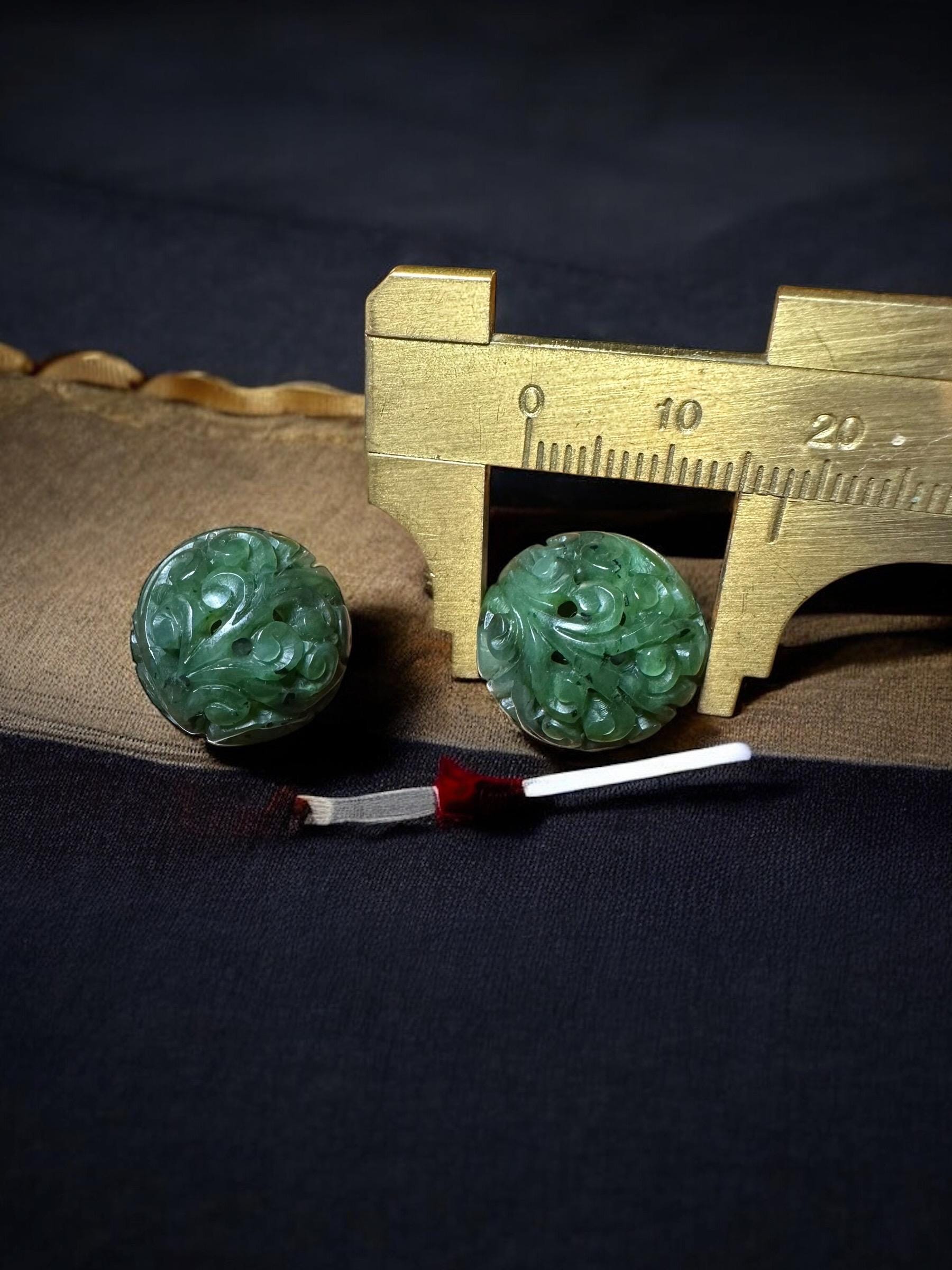 These exquisite hand-carved green jade beads showcase intricate filigree patterns, embodying traditional Chinese craftsmanship. Each bead is meticulously designed with swirling motifs, symbolizing prosperity and good fortune. The hollow design makes them lightweight, ideal for high-end jewelry making, including malas, bracelets, and statement necklaces.