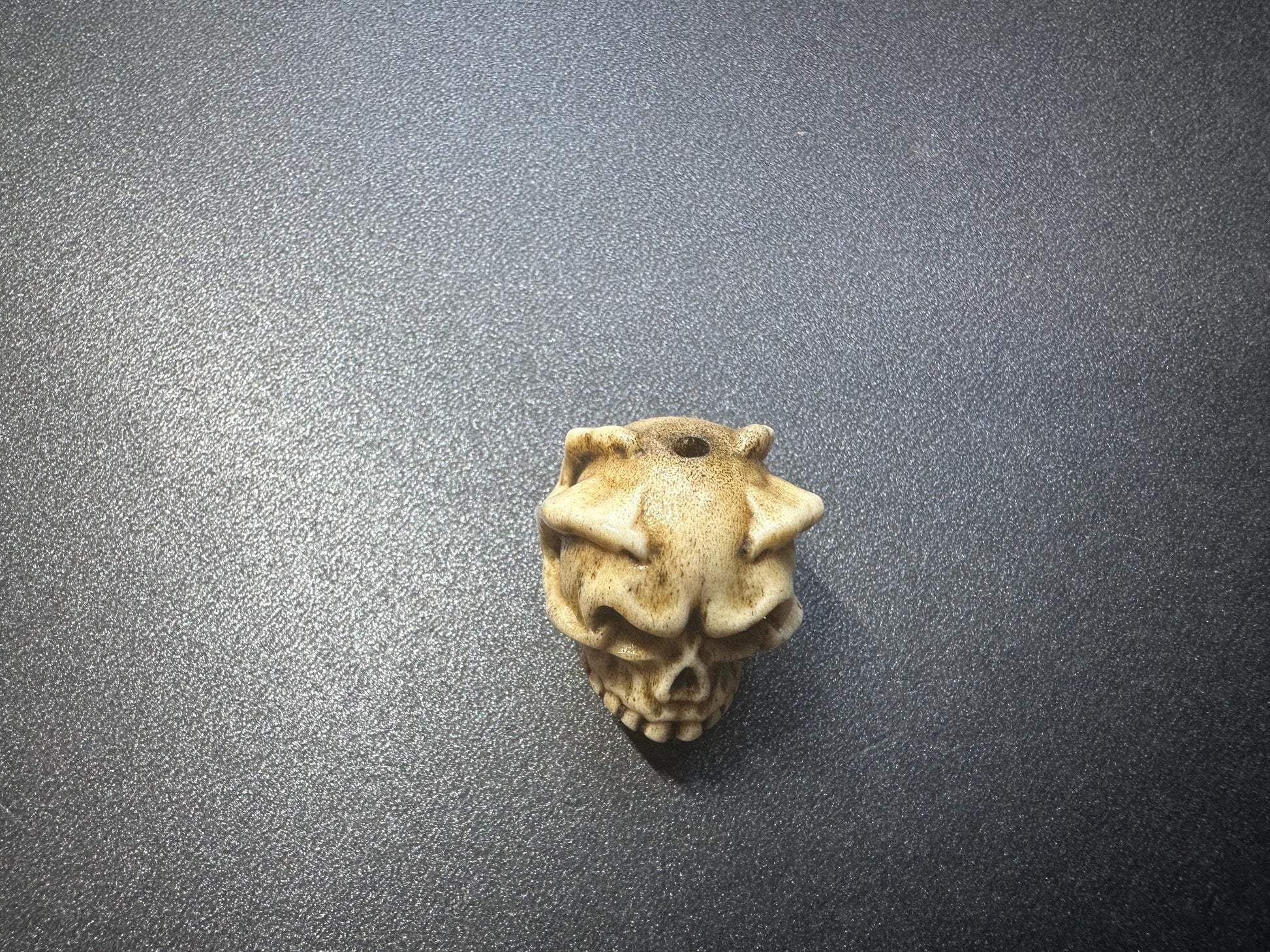 Hand-carved from natural deer antler, this small skull bead portrays a fierce cemetery guardian grabbing the back of the head with a single bony hand, evoking classic Tibetan charnel ground (Citipati) imagery. The detailed carving, warm antler grain and vertical drilling make it an ideal guru bead or focal charm for a mala, bracelet or necklace.