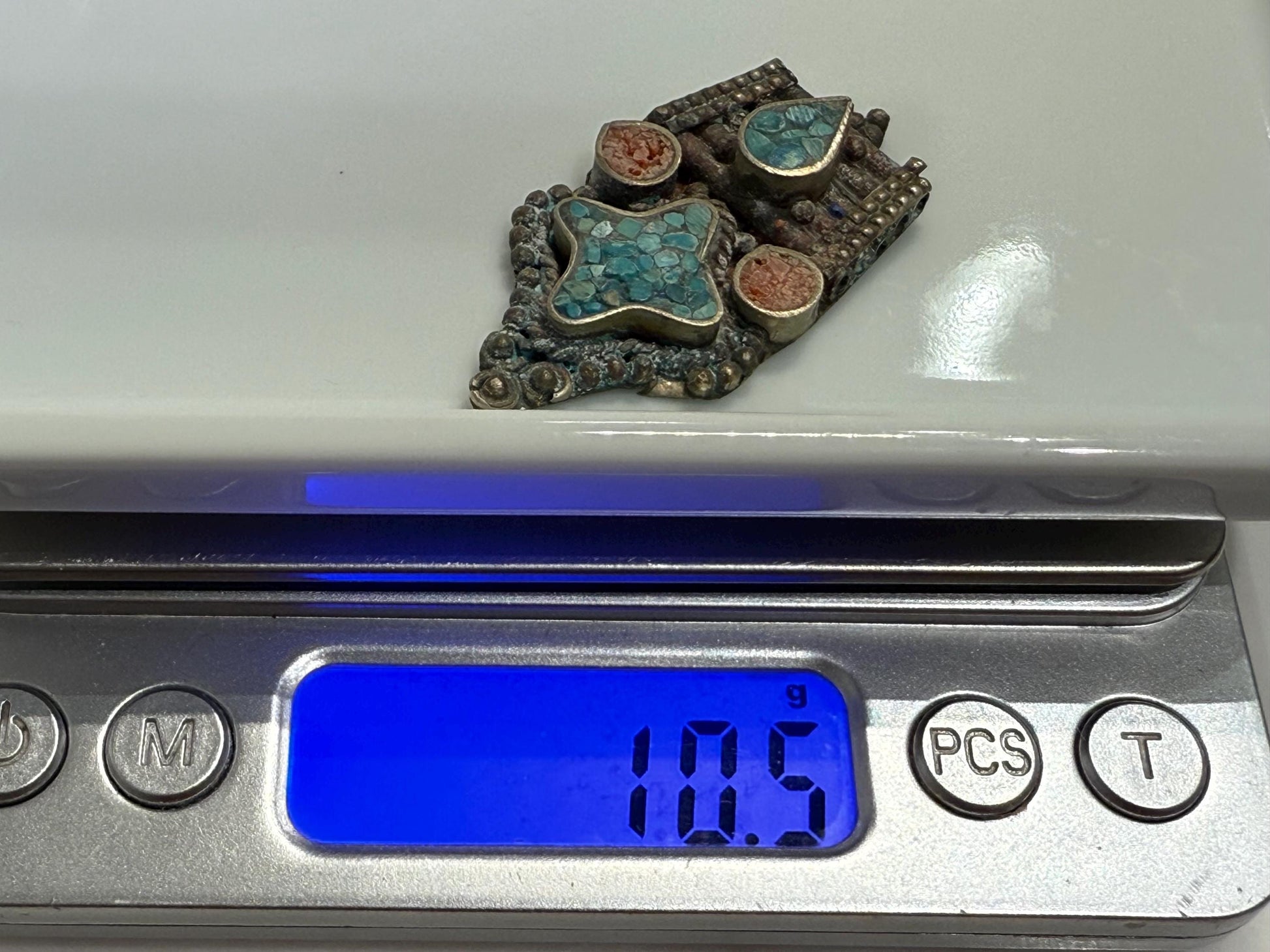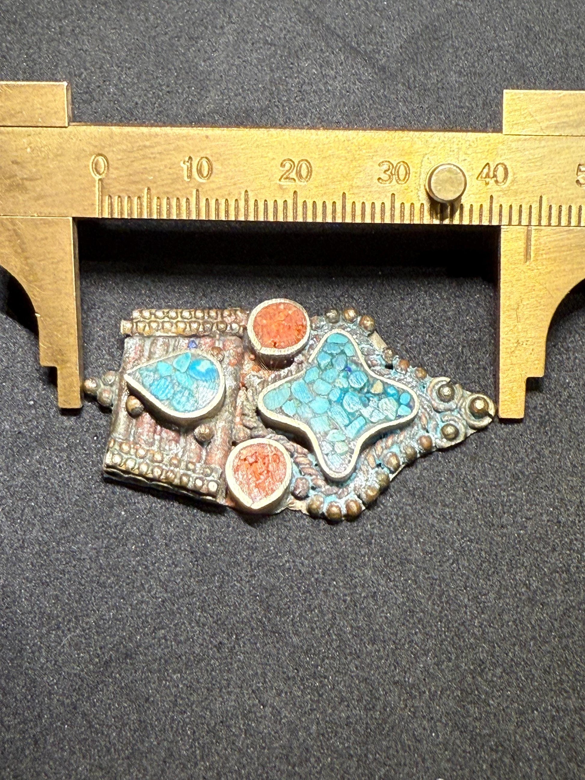 Add a unique touch of Himalayan craftsmanship to your jewelry designs with this stunning white metal pendant. Featuring vibrant inlays of turquoise and coral, this piece reflects traditional Nepali and Tibetan artistry. The intricate metal detailing and rustic finish make it perfect for tribal, bohemian, or spiritual-themed jewelry projects.