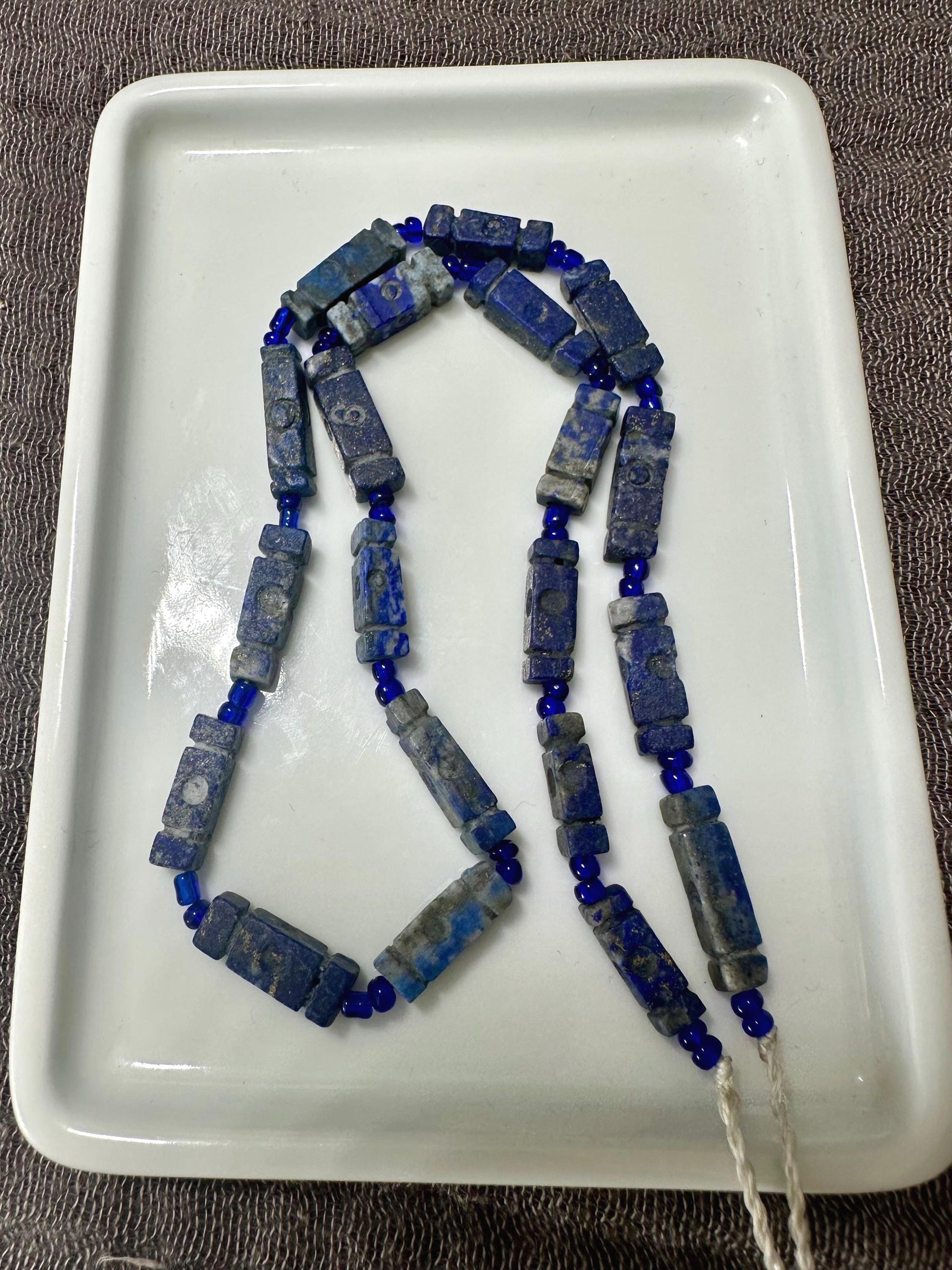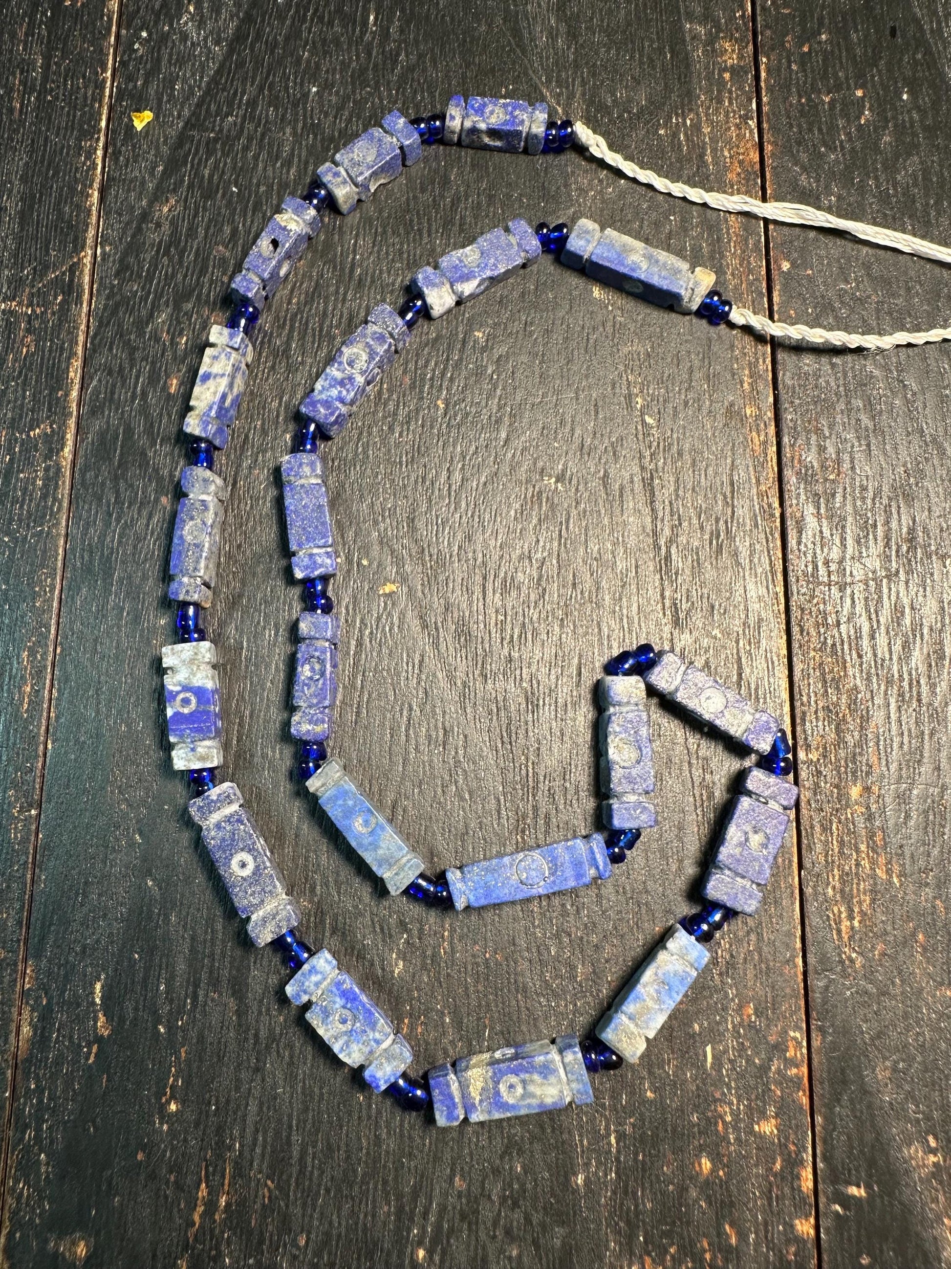 This stunning handmade necklace features natural Lapis Lazuli beads sourced from Afghanistan, showcasing deep royal blue hues with beautiful natural patterns. The rectangular lapis beads are complemented by small blue glass seed beads, creating a striking and elegant design.