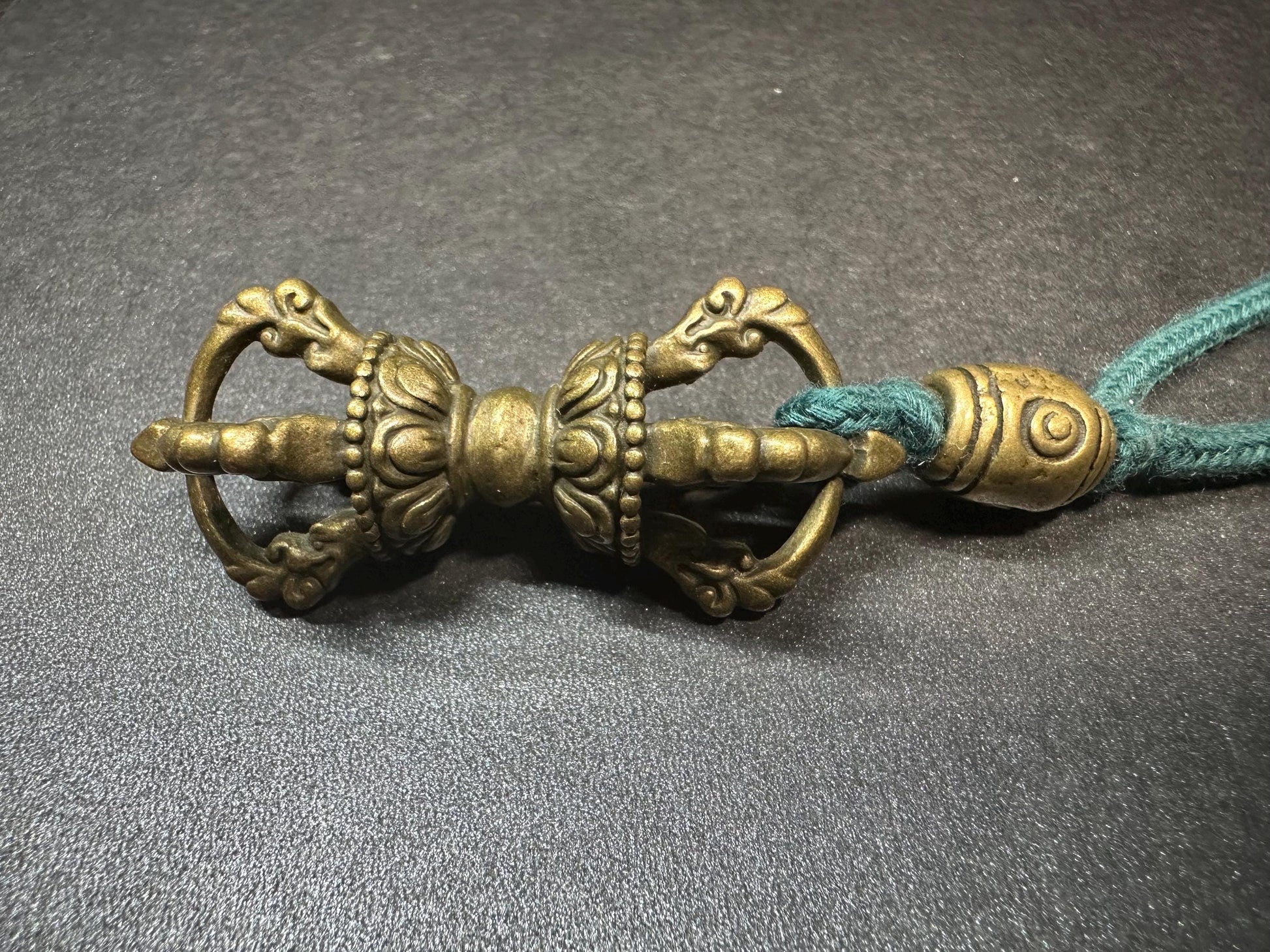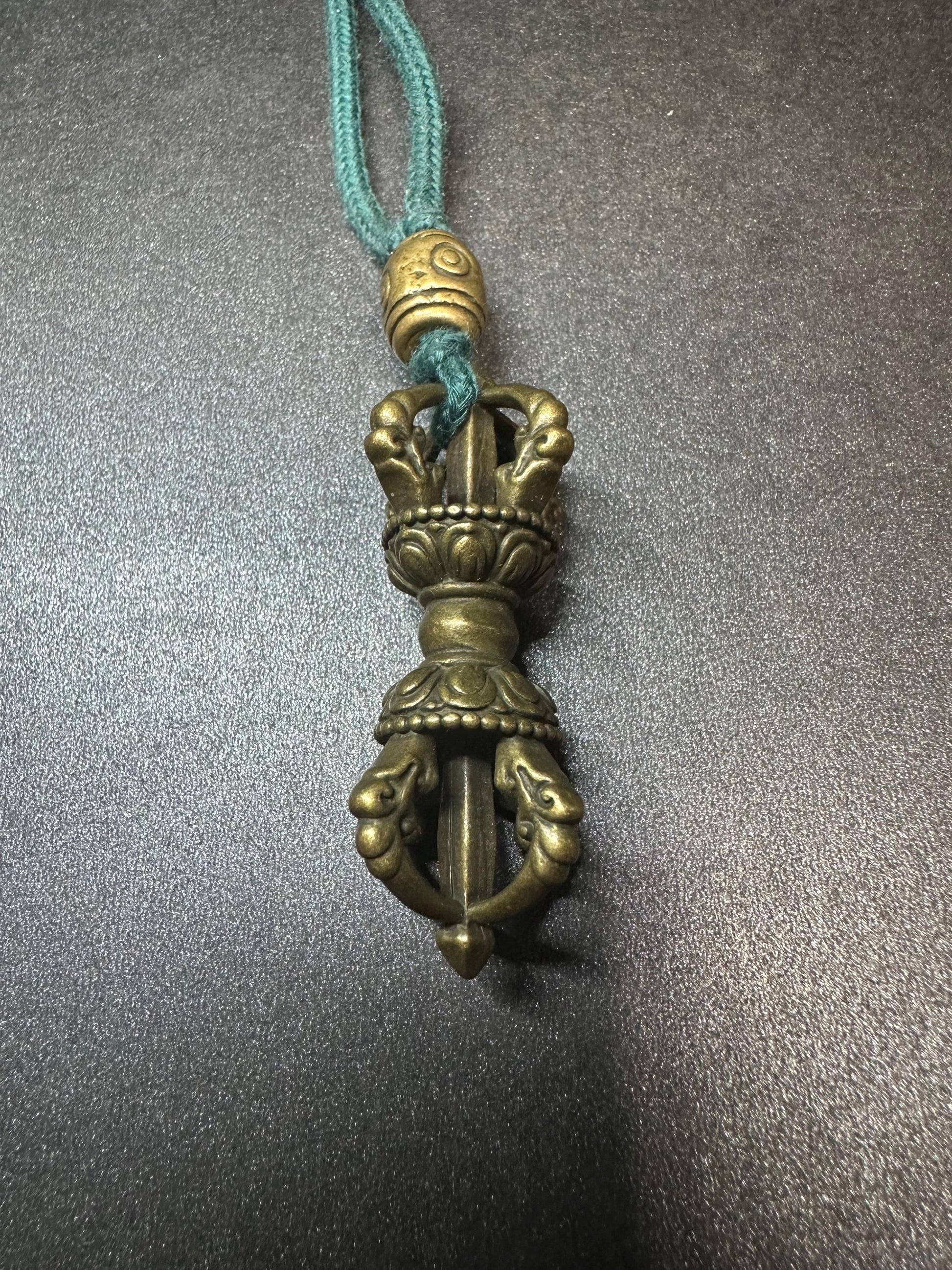 This handmade brass four‑pronged double dorje / phurba pendant carries the strong protective energy of Tibetan Vajrayana practice. The four vajra prongs radiating in all directions symbolize the indestructible wisdom that dispels obstacles in every realm, while the central phurba blade represents subduing negative forces and stabilizing the mind on the path of awakening.