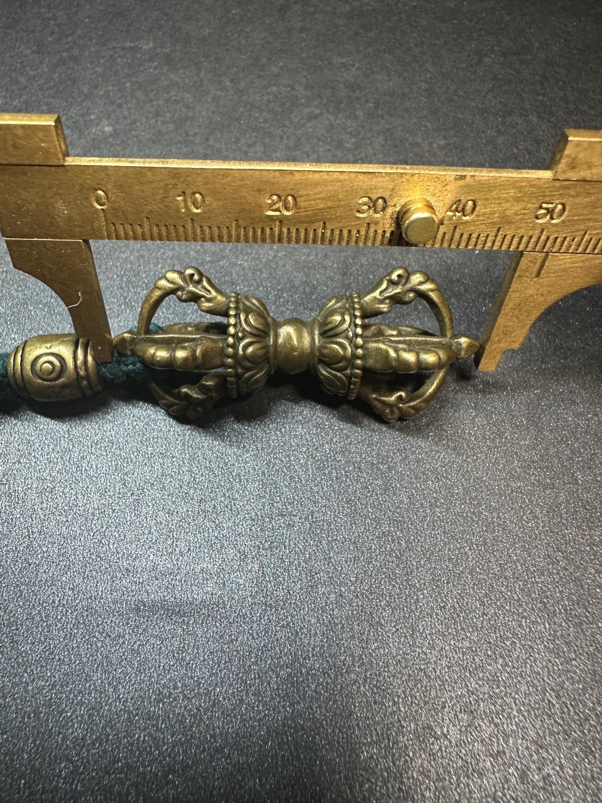 Cast in solid brass with an antique-style patina, the pendant shows traditional lotus petals and beaded detail, and comes strung with a matching brass guru bead on a soft woven cord for comfortable daily wear. Its compact size makes it perfect as a personal protection amulet, a meditation necklace, or a small ritual implement for a travel altar or shrine.