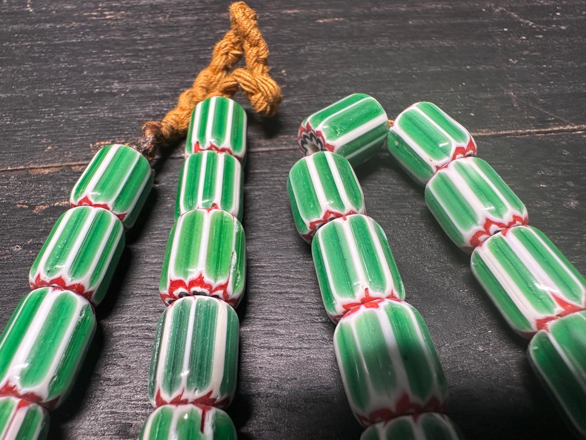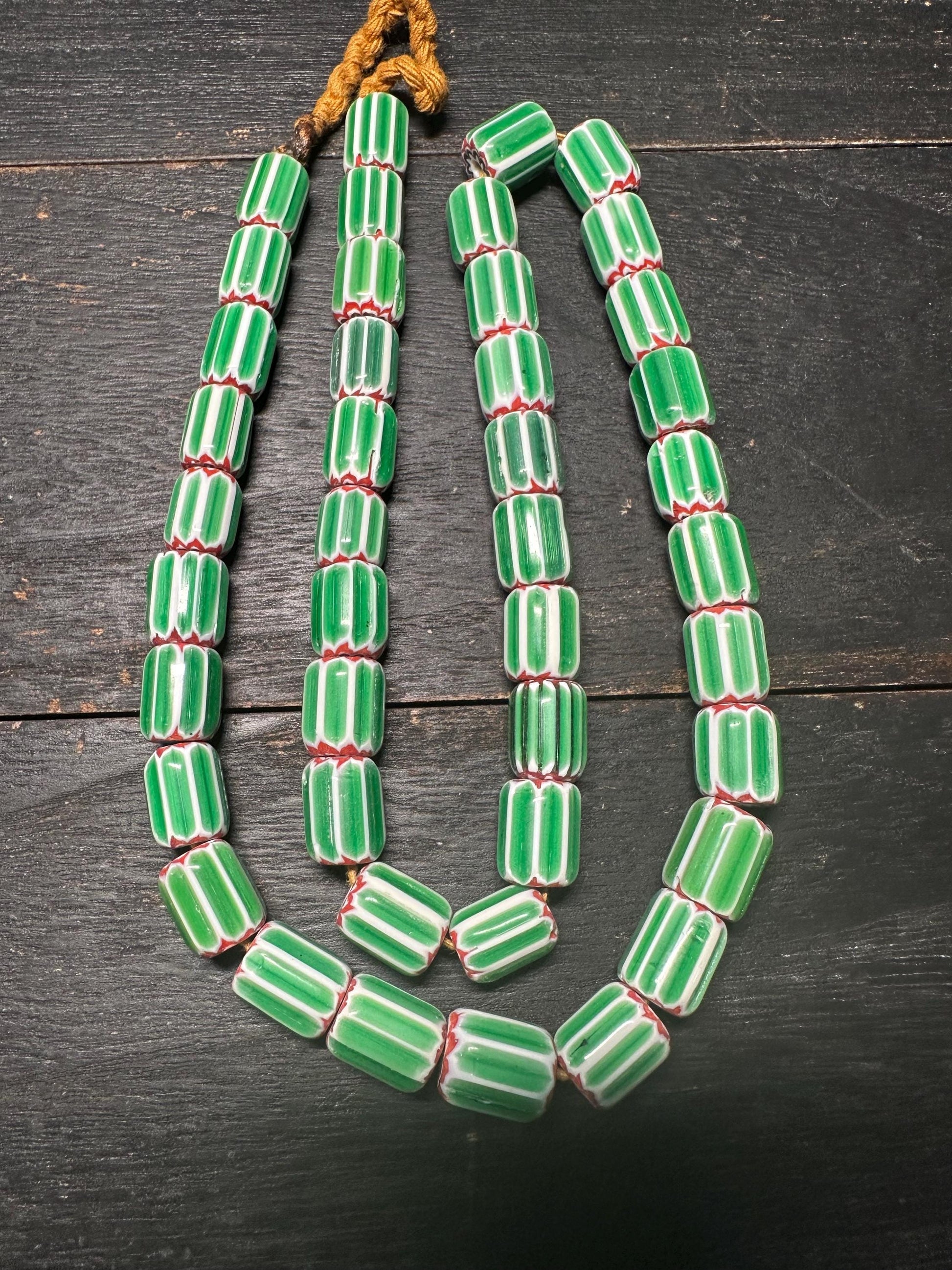 This beautiful strand features handmade Nepal Chevron-style beads in vibrant green, accented with white stripes and red core highlights. Inspired by the historic African trade beads and Venetian chevron designs, these beads are perfect for jewelry makers, collectors, or anyone who loves unique, ethnic pieces.