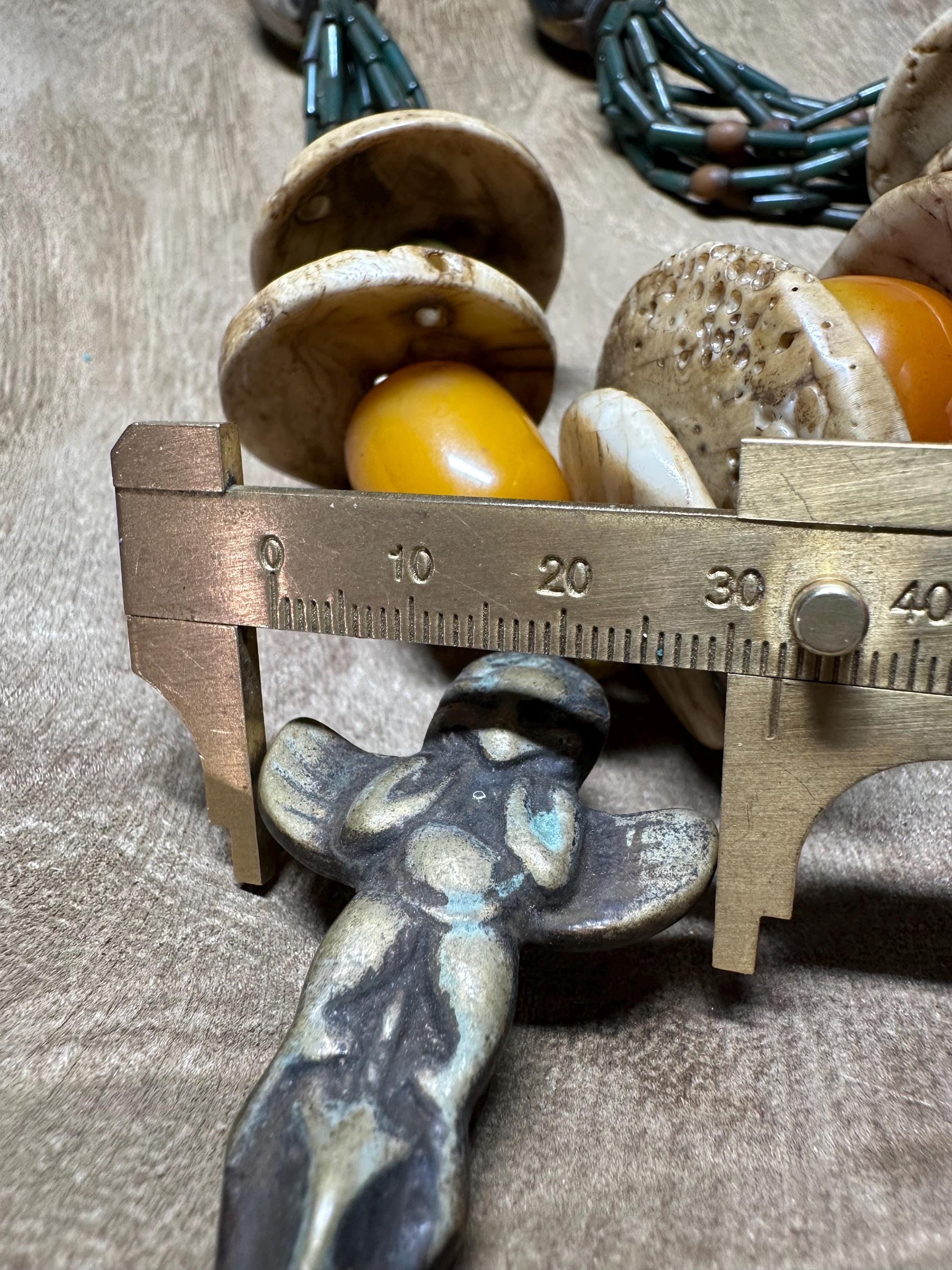 • Focal Beads: Amber-colored resin, bone discs, green stone spacers