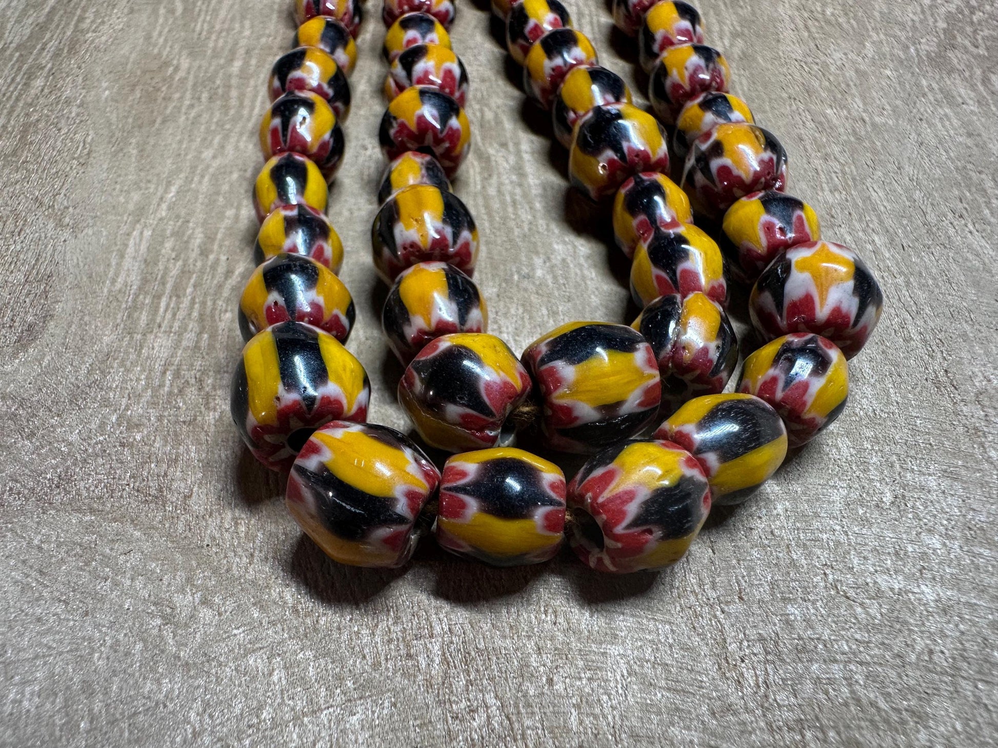 Bring bold color and cultural charm to your designs with this vibrant strand of handmade Nepalese Chevron-style beads. These glass beads are carefully crafted with layered patterns in black, yellow, red, and white—perfect for jewelry making, crafts, or collectors of trade-style beads.
