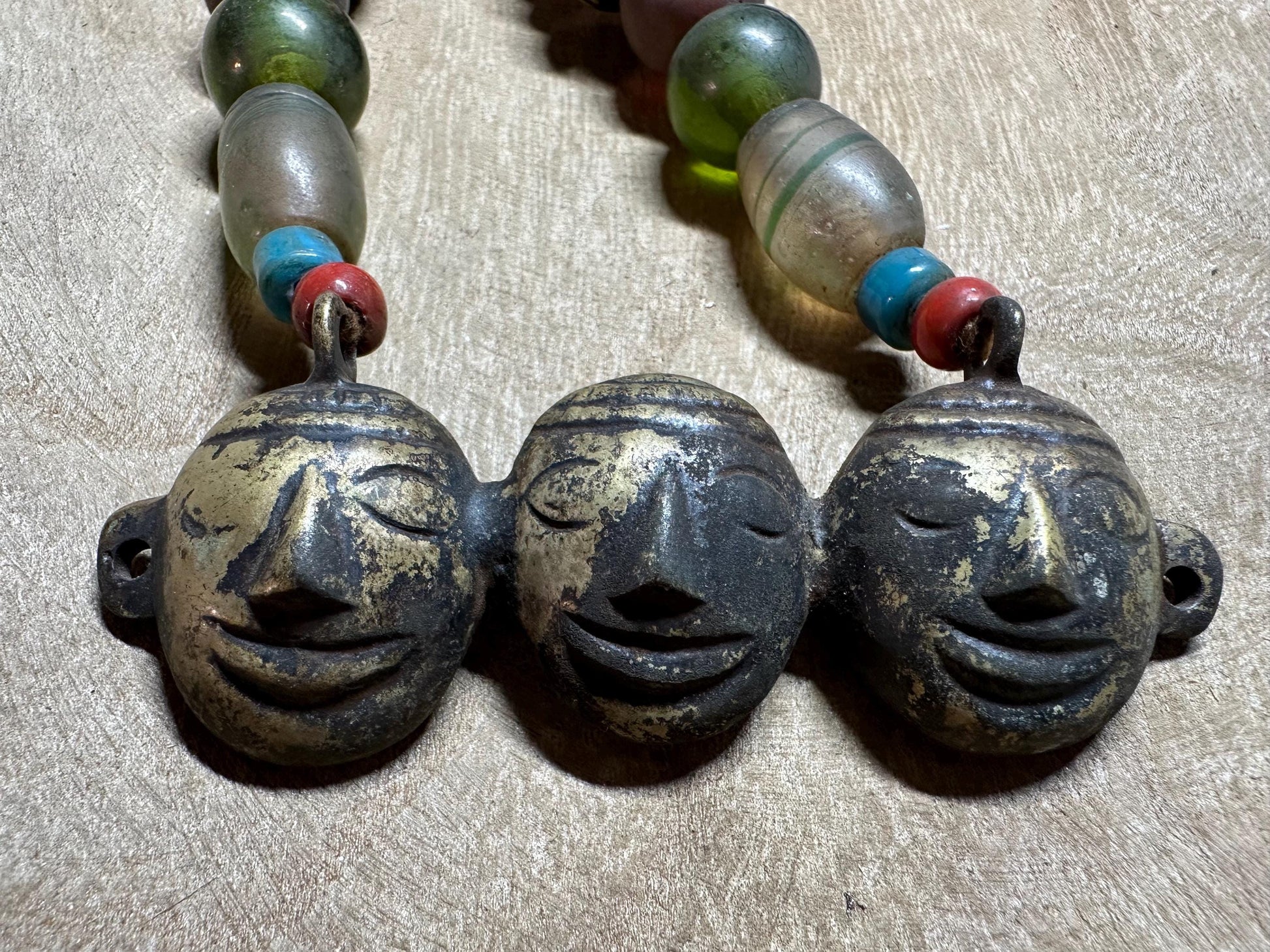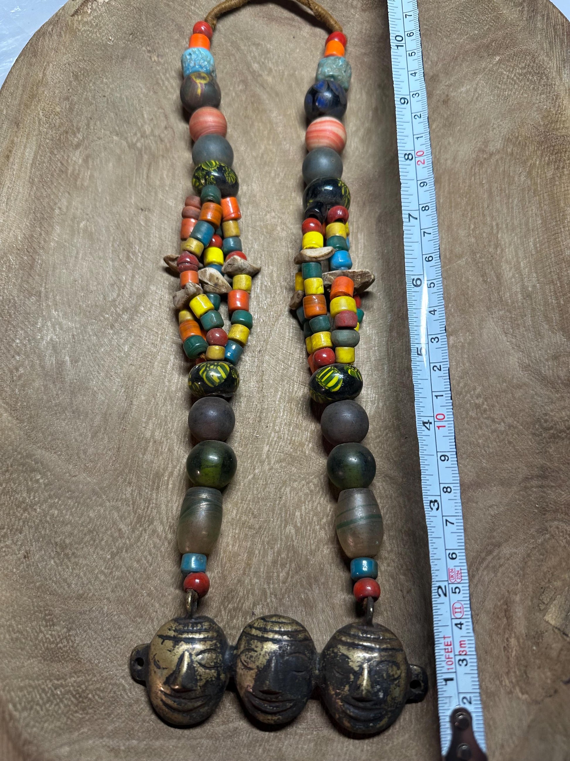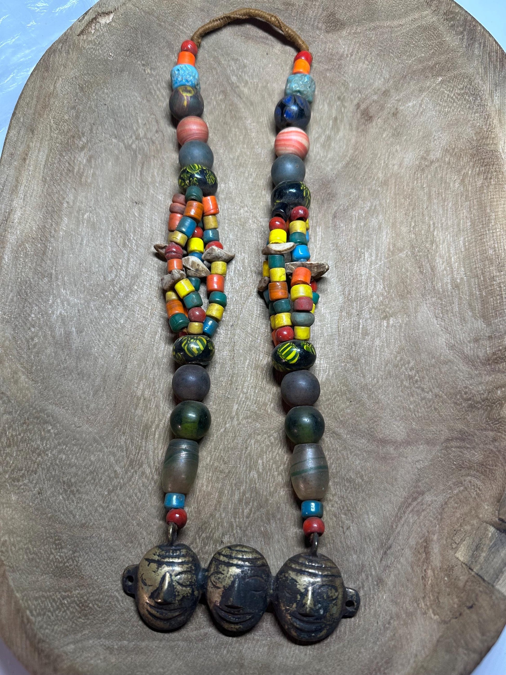 Handmade Nepalese Tribal Beaded Necklace with Brass Face Pendants Ethnic Himalayan Boho Statement Jewelry