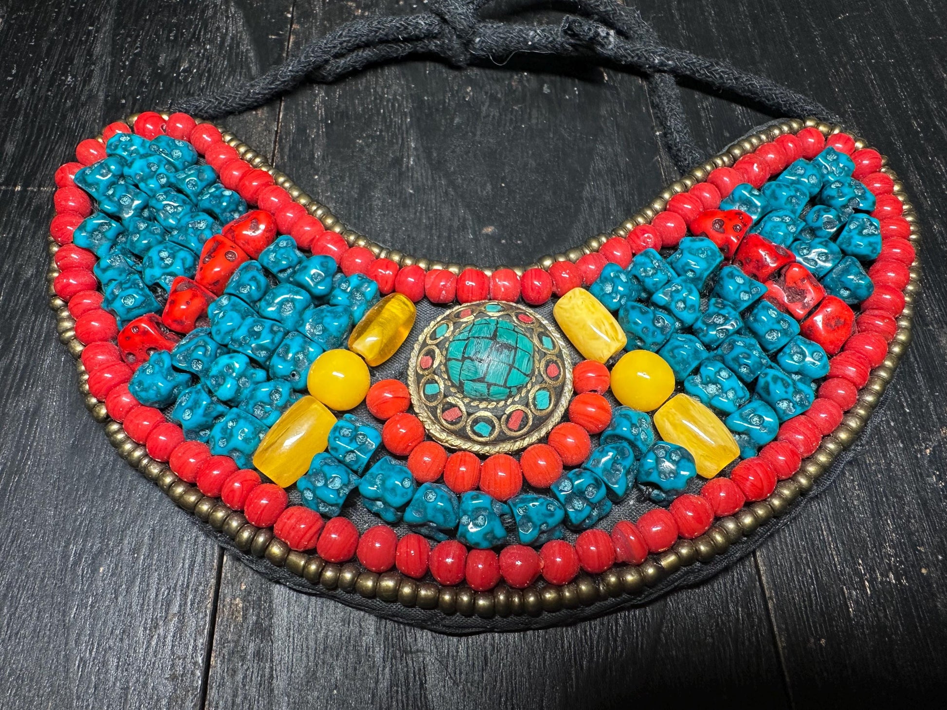 Make a bold statement with this unique handmade Tibetan Nepalese necklace. Expertly handcrafted by local artisans, this piece features vibrant resin beads imitating turquoise (color may appear more blue depending on lighting), bright red resin coral beads, warm amber-tone resin beads, and metallic-finish glass beads. The centerpiece is a beautifully inlaid round mosaic pendant, adding an authentic touch of Himalayan and Tibetan tribal culture.