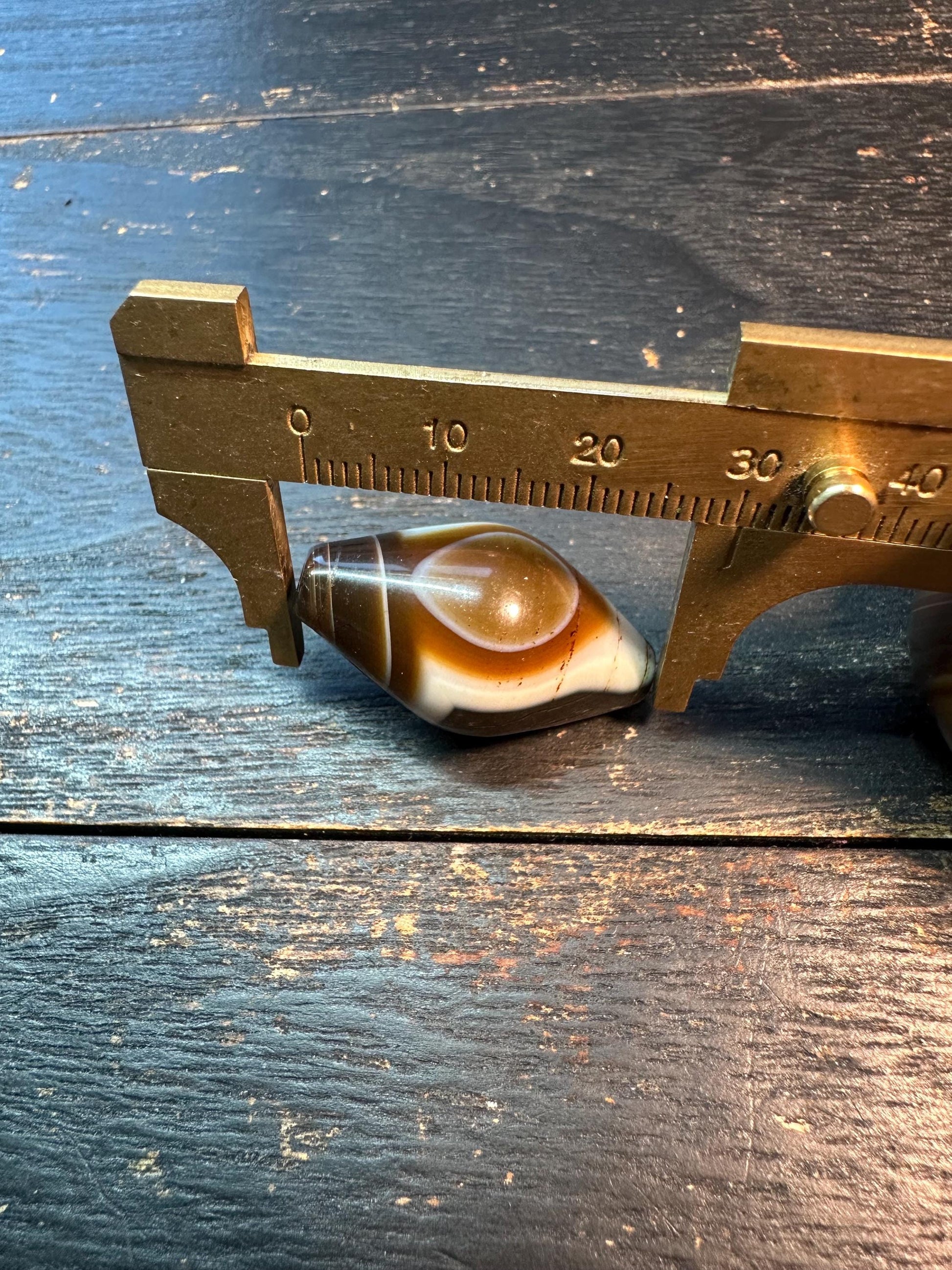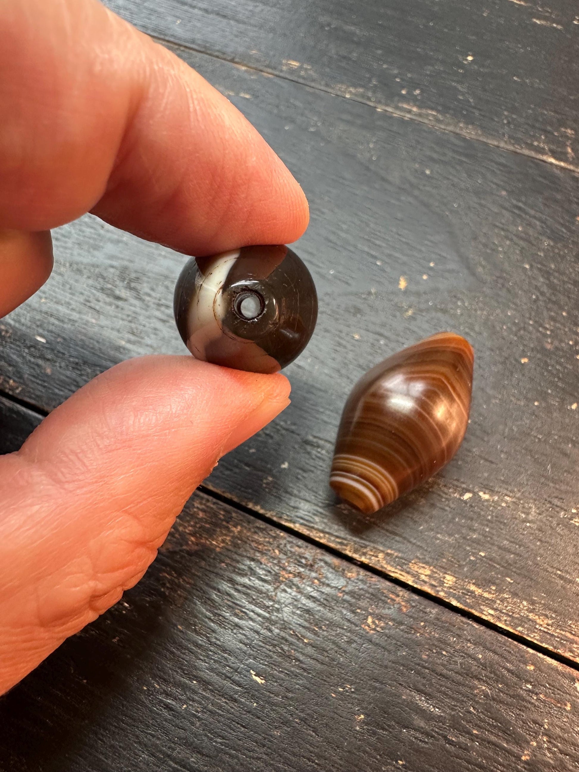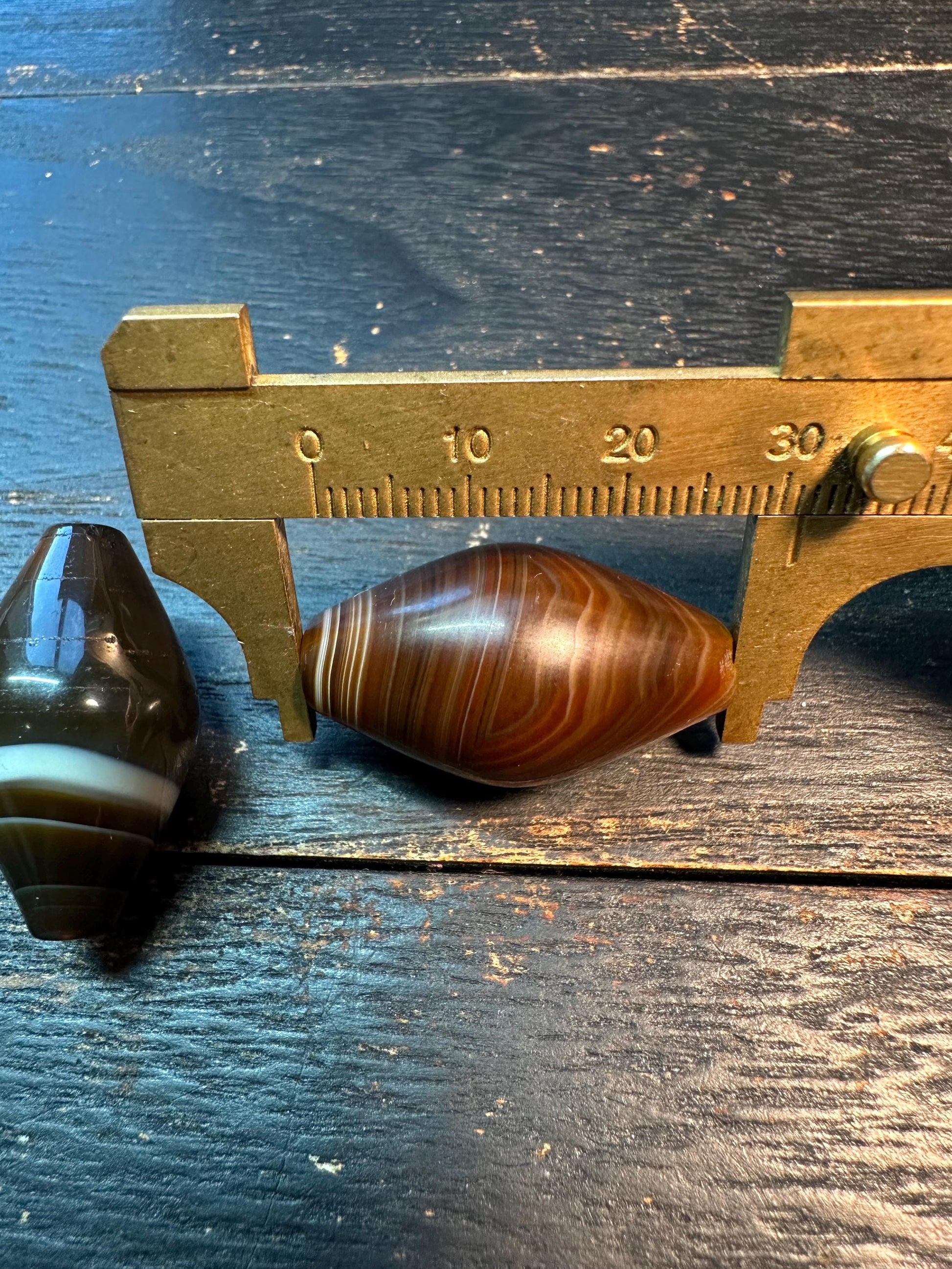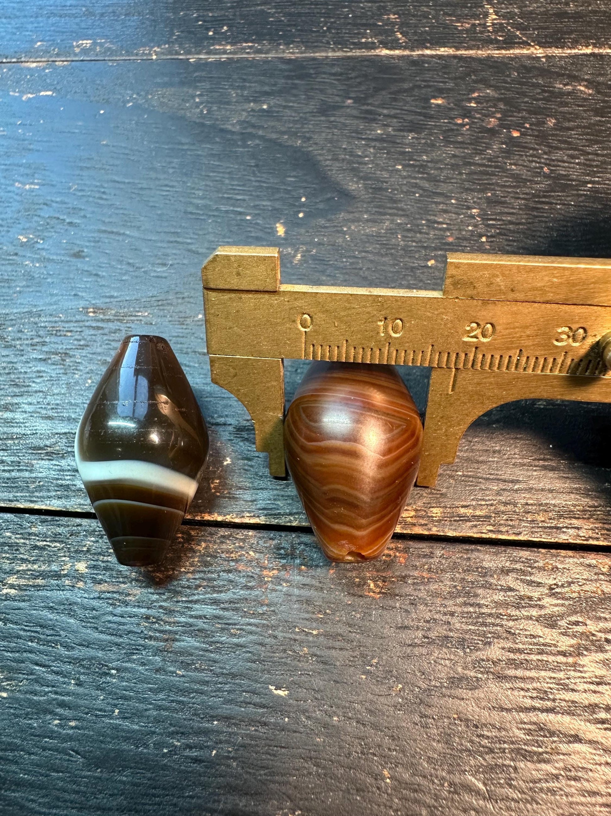 Pair of beautiful handmade-style Banded Agate beads in a unique olive shape, sourced from the Himalayan region. These beads feature gorgeous natural stripes, combining earthy browns, creams, and whites, with each bead being truly one-of-a-kind.
