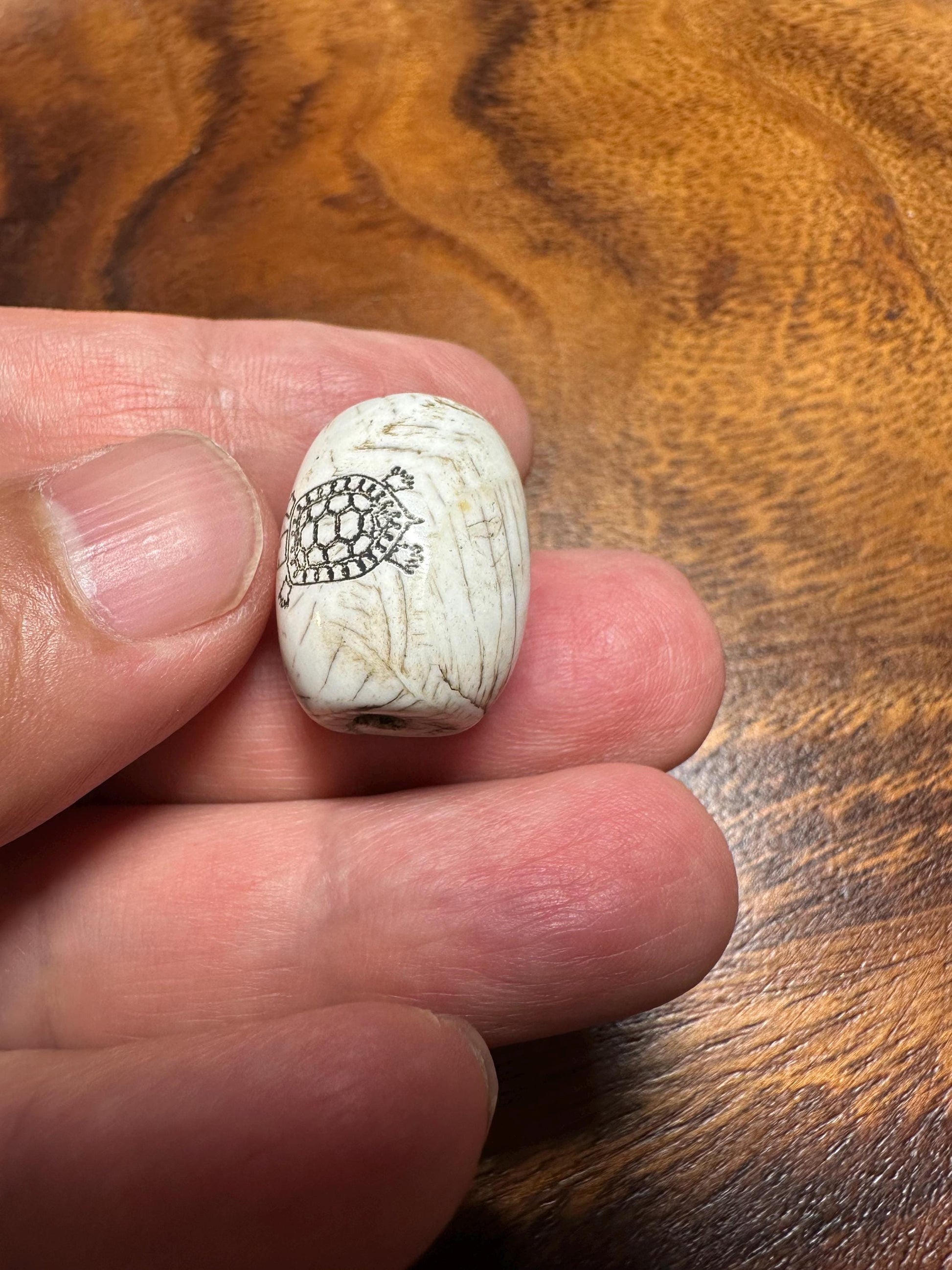 This unique handcrafted bead is made from natural conch shell and features a hand-engraved turtle motif, symbolizing longevity and protection in many indigenous traditions. The lower portion is beautifully inlaid with crushed turquoise and coral powder, reflecting a tribal Naga aesthetic.