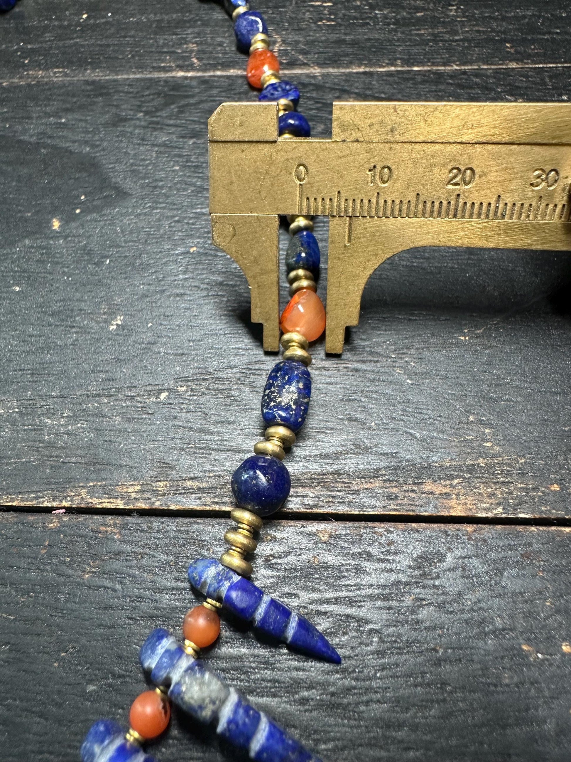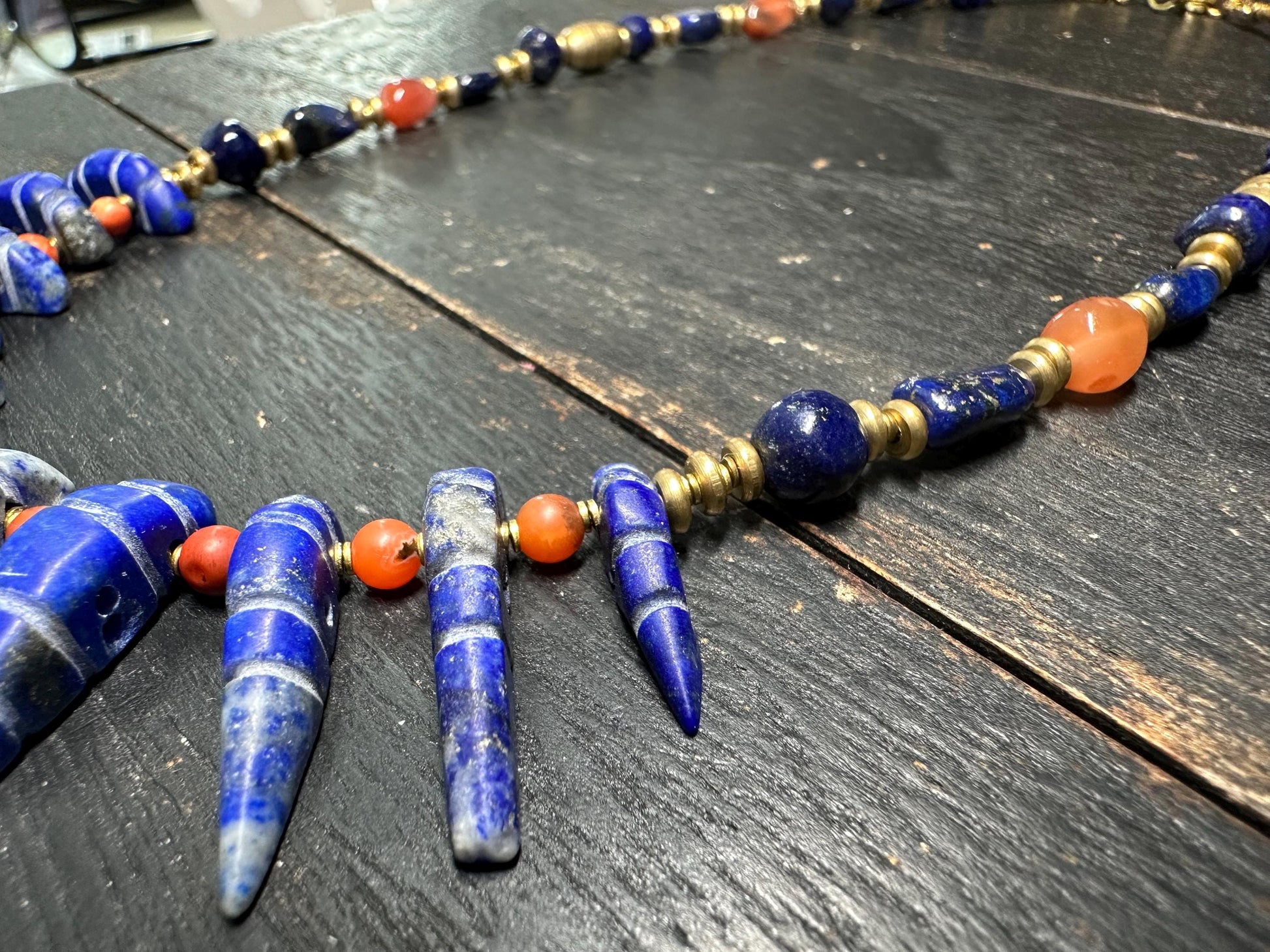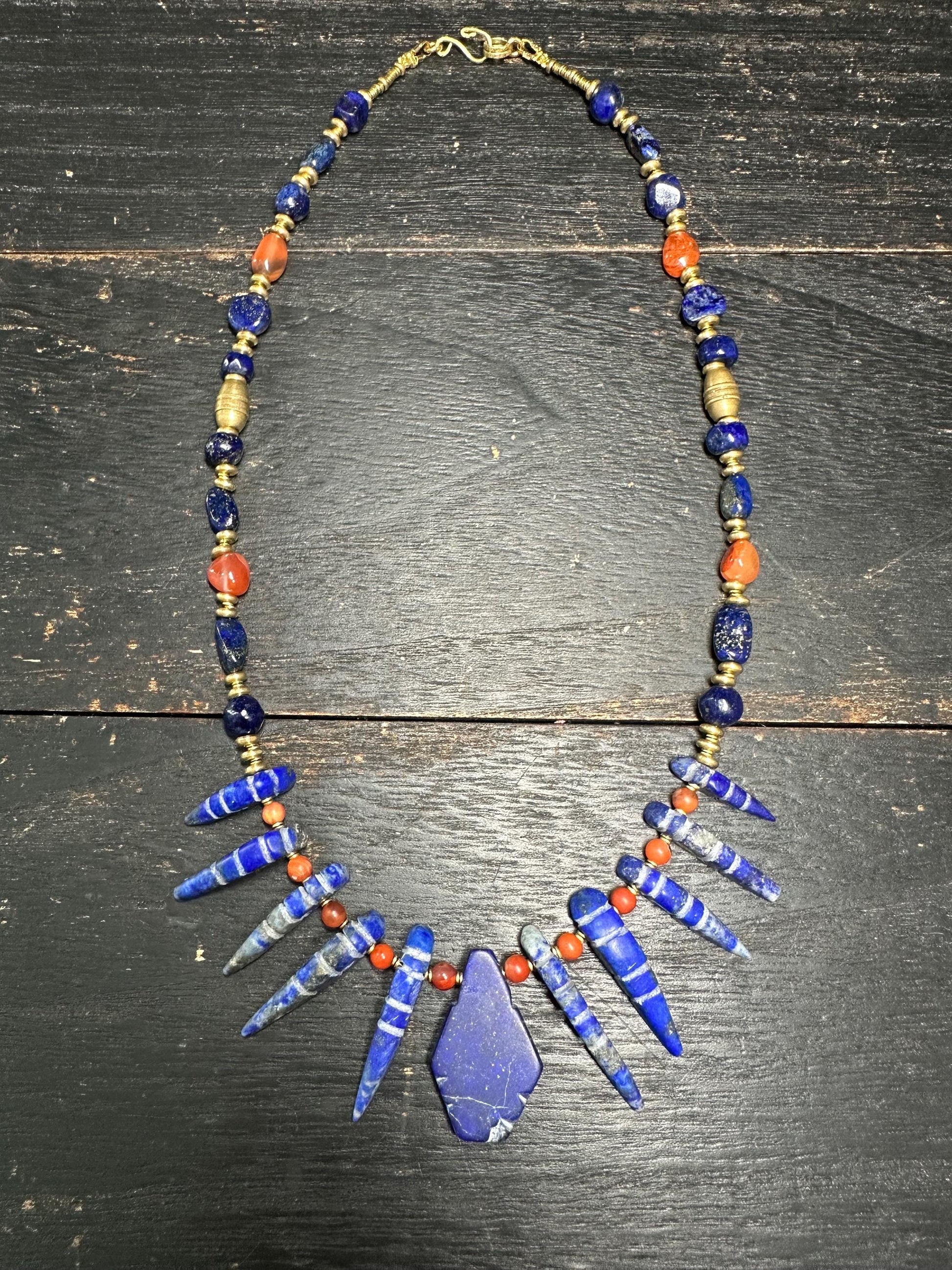 This one-of-a-kind necklace features deep blue natural lapis lazuli tube beads, paired with warm red agate rounds and fossilized ostrich shell bead spacers — materials rich in tradition and symbolism. The rustic textures and bold contrast create a piece that’s both ancient-inspired and effortlessly wearable today.