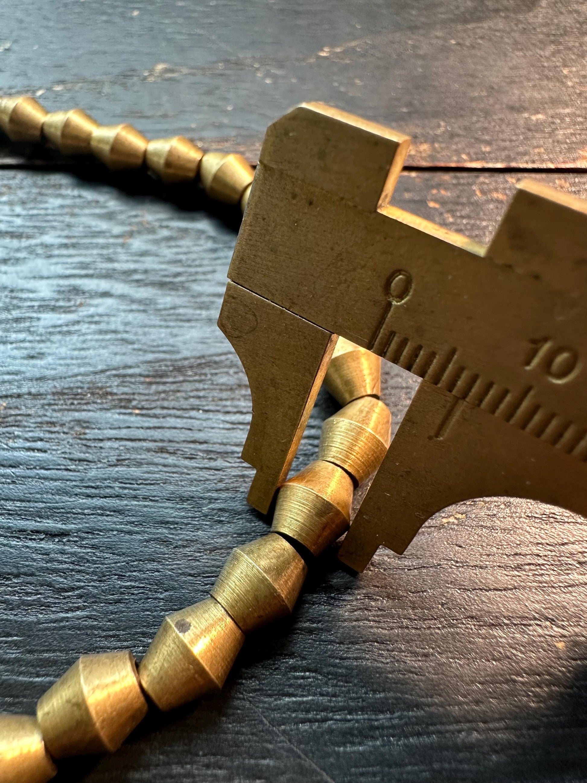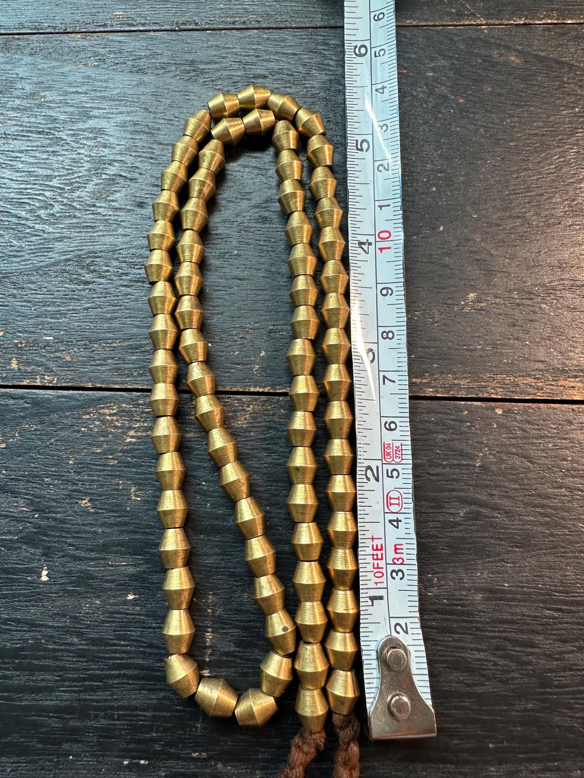 Featured here is a strand of genuine handmade Nepal copper cone beads, each bead shaped into a distinctive geometric bi-cone form, measuring about 7x8mm. The strand length is approximately 21–22 inches, strung on classic Nepalese cord. With their unique faceted/cone design and warm copper patina, these beads are ideal for jewelry makers seeking tribal style, boho accents, or statement pieces. Every bead is crafted by hand, so natural variation in shape and finish is expected, adding authentic artisan charm to each strand.