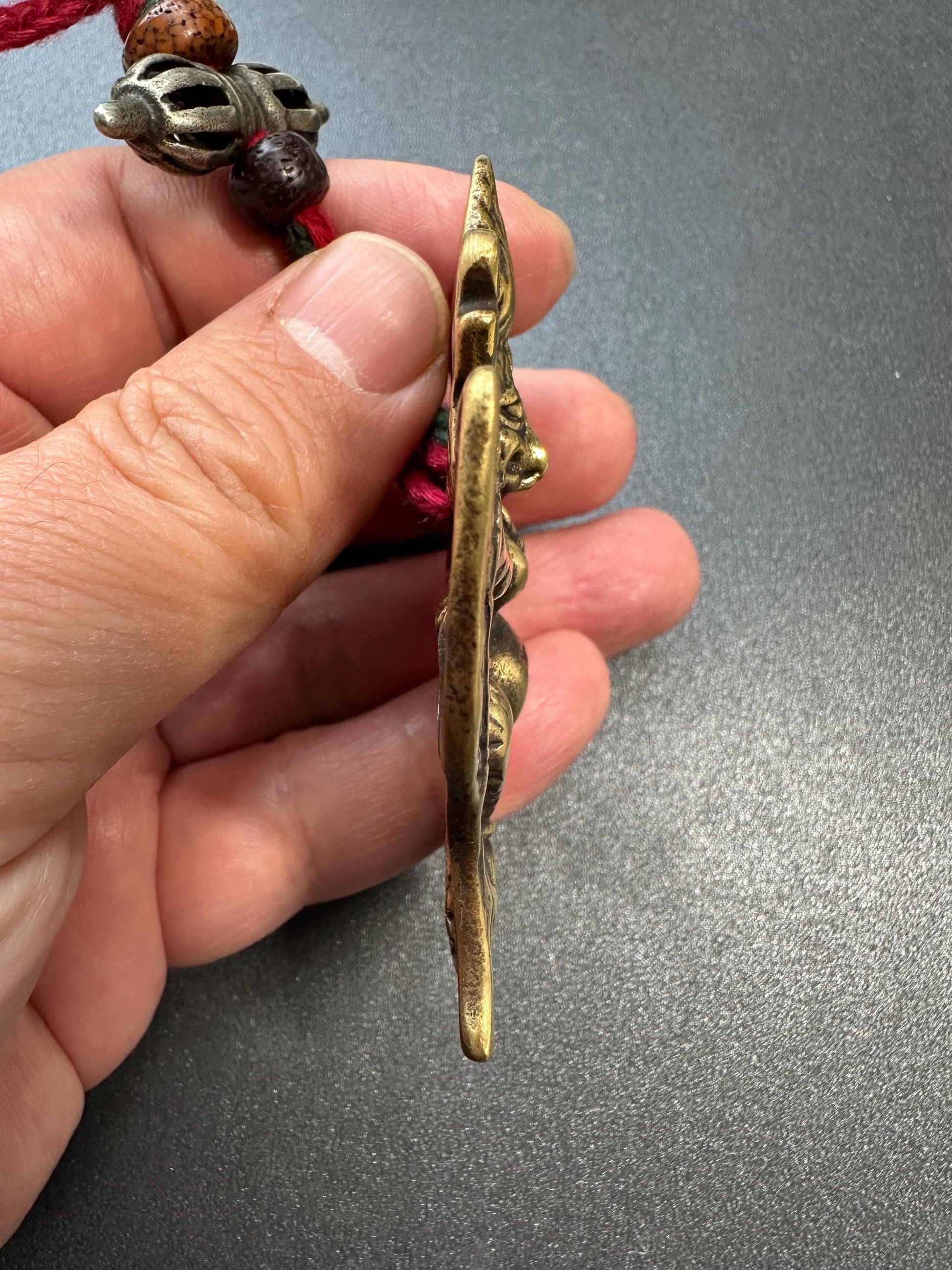 Expertly cast in solid brass, this traditional pendant stands about 59mm by 66mm as pictured. It includes braided Tibetan cord and accent beads for a genuine look and feel. The intricate motif displays Garuda’s distinctive wings, face, and symbolic posture, offering powerful spiritual symbolism and blessings.