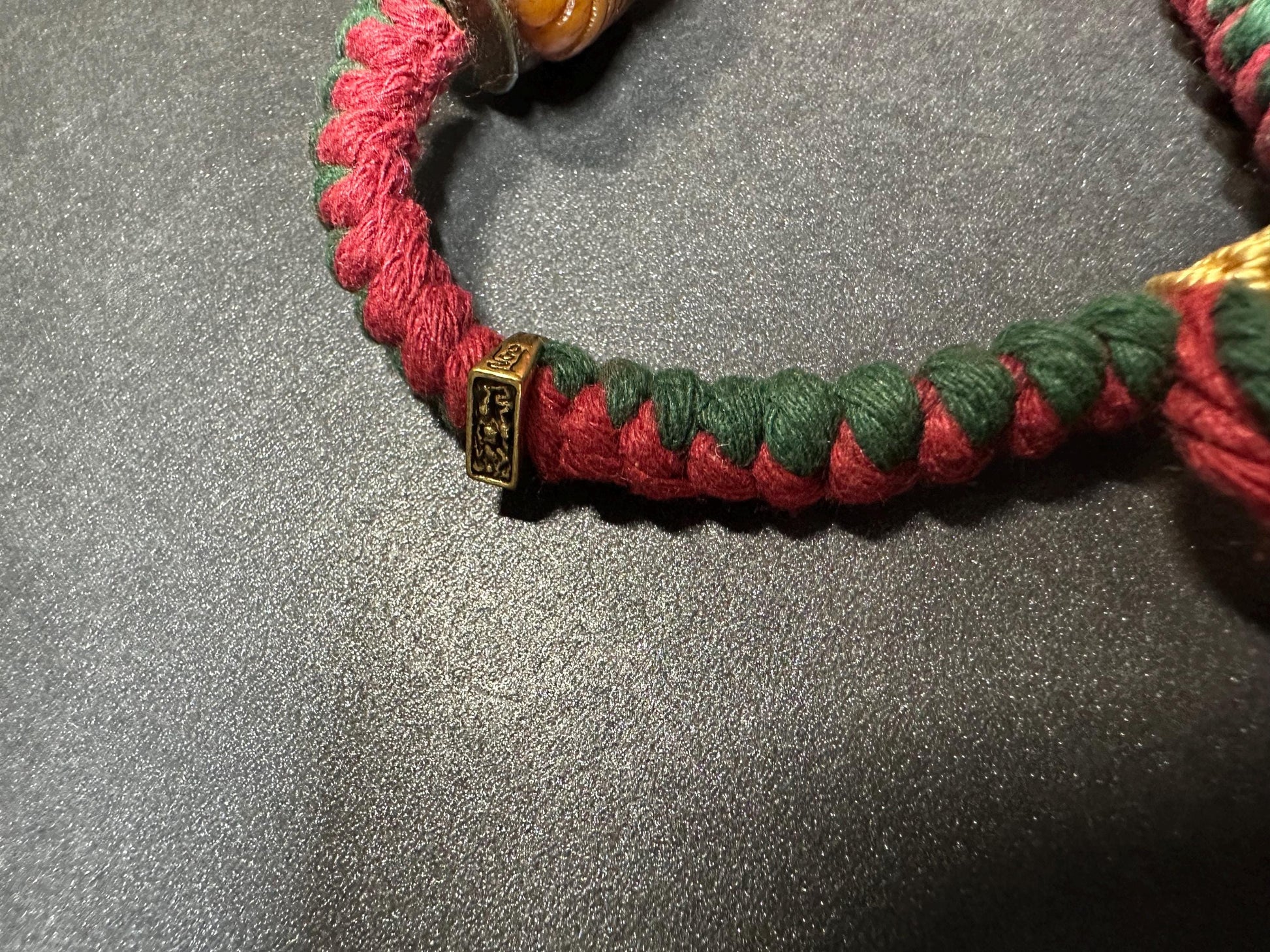 • Materials: Genuine yak bone centre bead with warm natural patina; cotton or wool braided cord in deep red and green; brass‑tone mantra spacer beads and knot details.