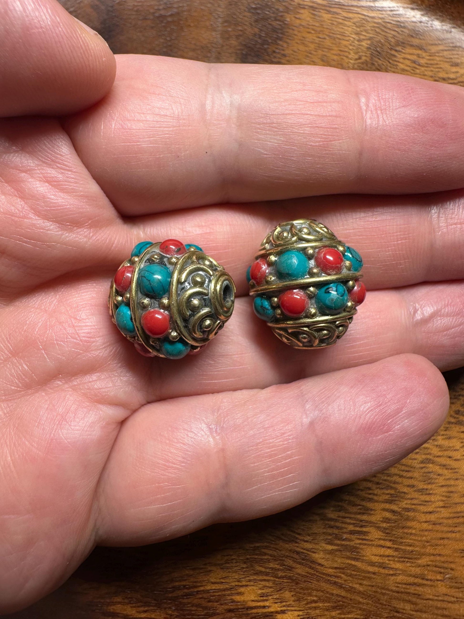 Nepal Tribal Brass Beads: Turquoise & Coral Inlay, Boho Jewelry (Set of 2)