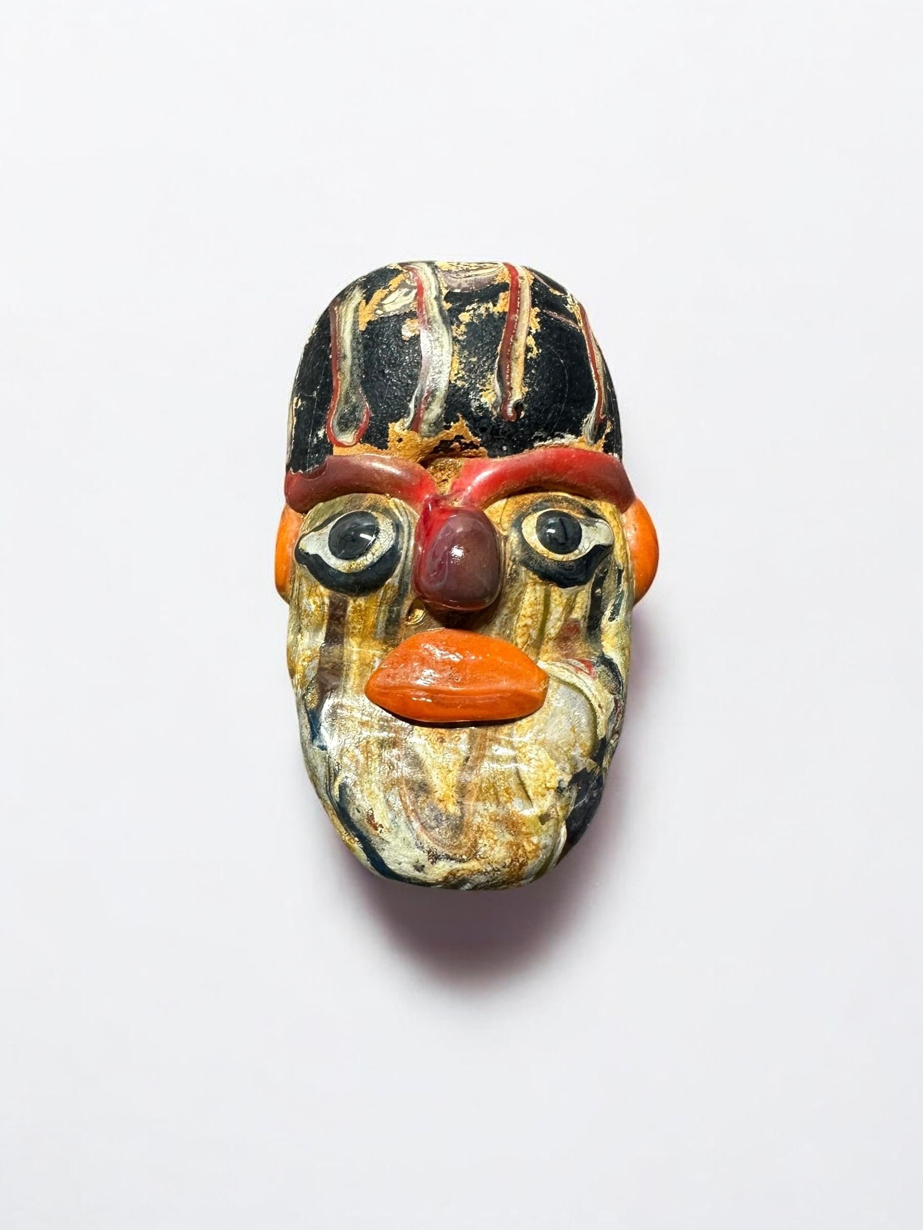 This unique pendant can serve as a remarkable collectible or a statement piece in jewelry design. Its detailed facial features and bold colors make it a testament to the artistry of ancient civilizations.