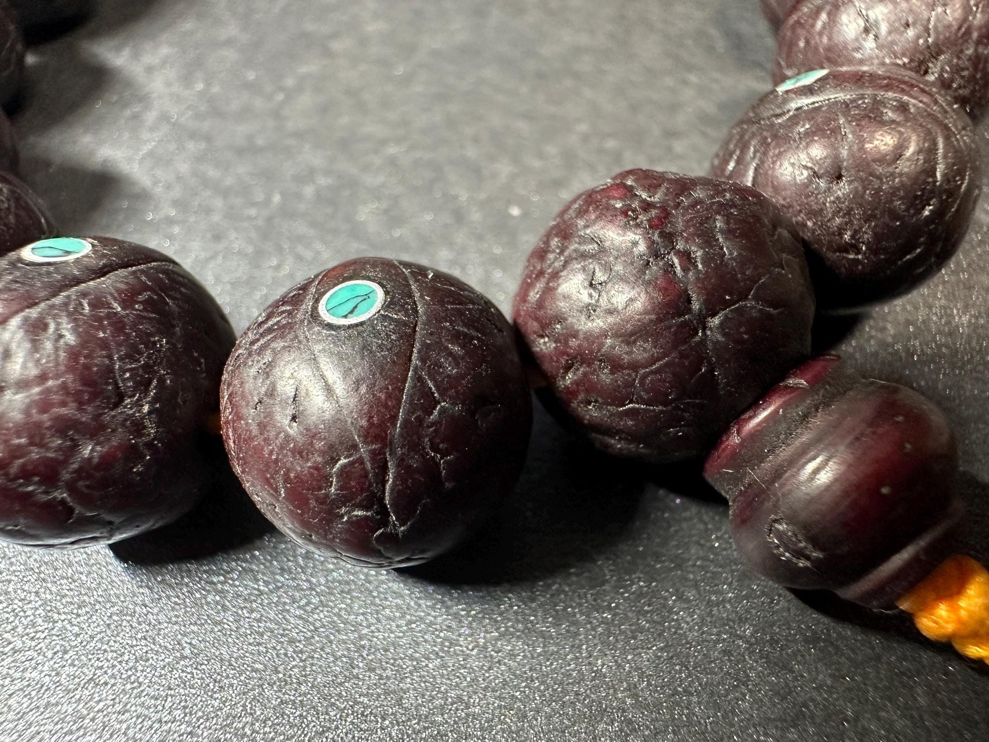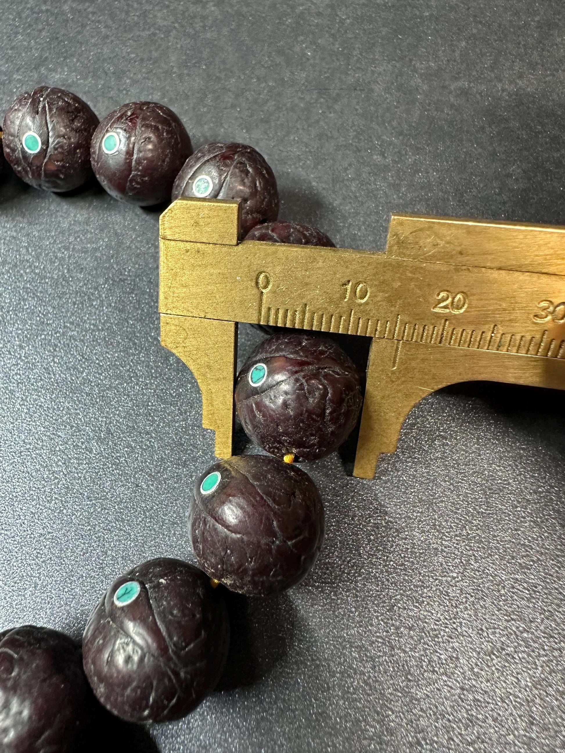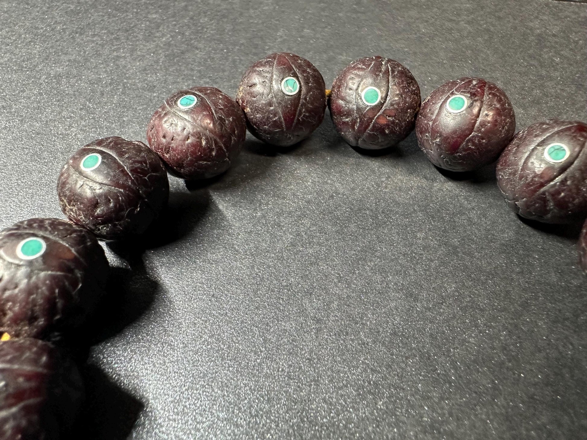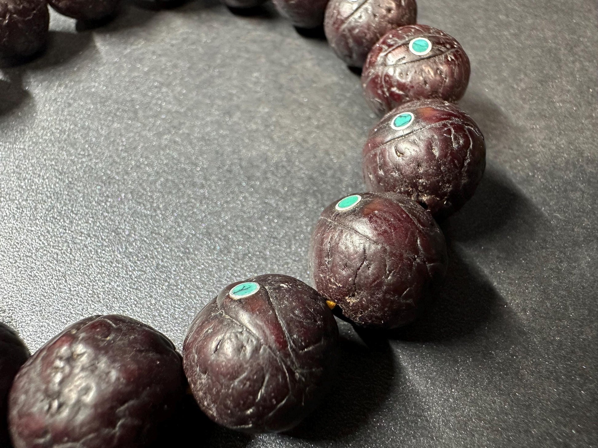 Elevate your spiritual practice or daily wear with this handcrafted Fengyan (Phoenix Eye) Bodhi seed mala bracelet. Each dark, aged Bodhi seed bead (approx. 16mm diameter) is beautifully inlaid with genuine turquoise, creating an eye-catching and meaningful accessory. Bodhi seeds symbolize enlightenment, spiritual growth, and mindfulness, while turquoise is believed to bring protection and healing energy.