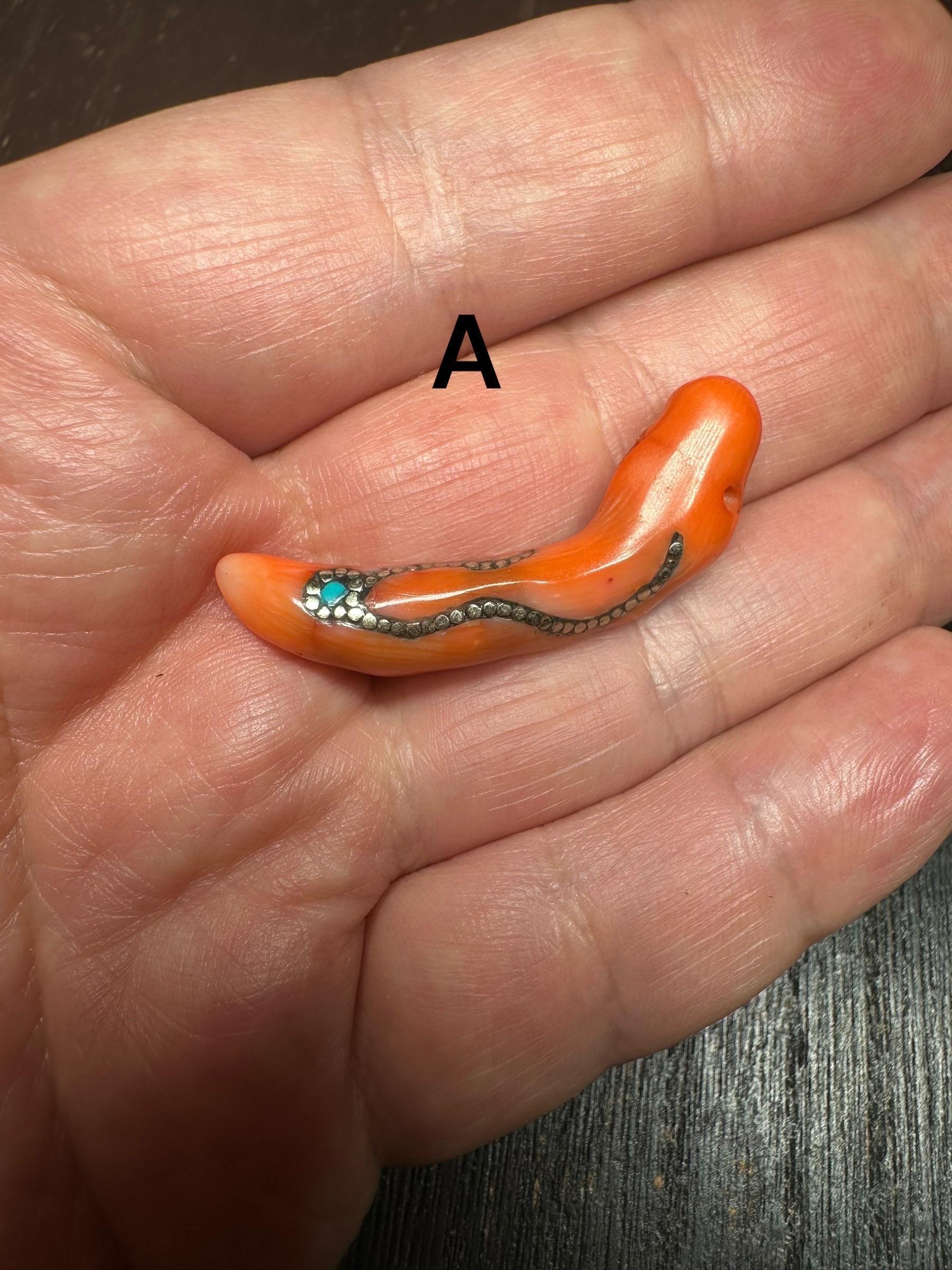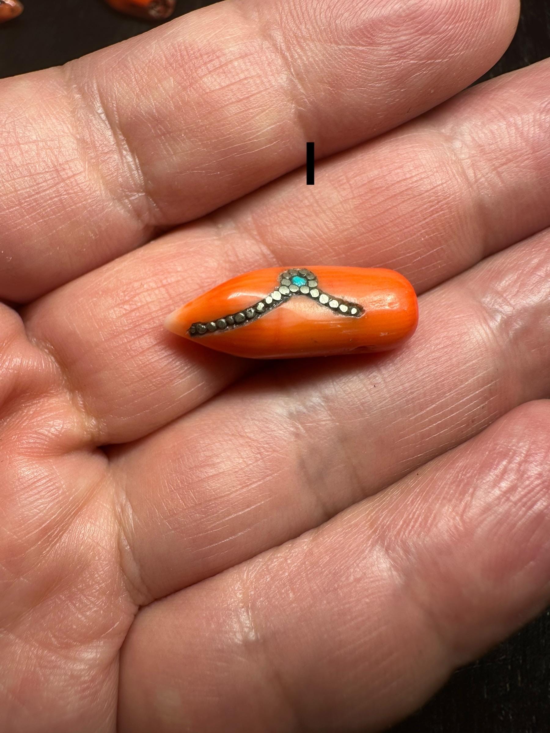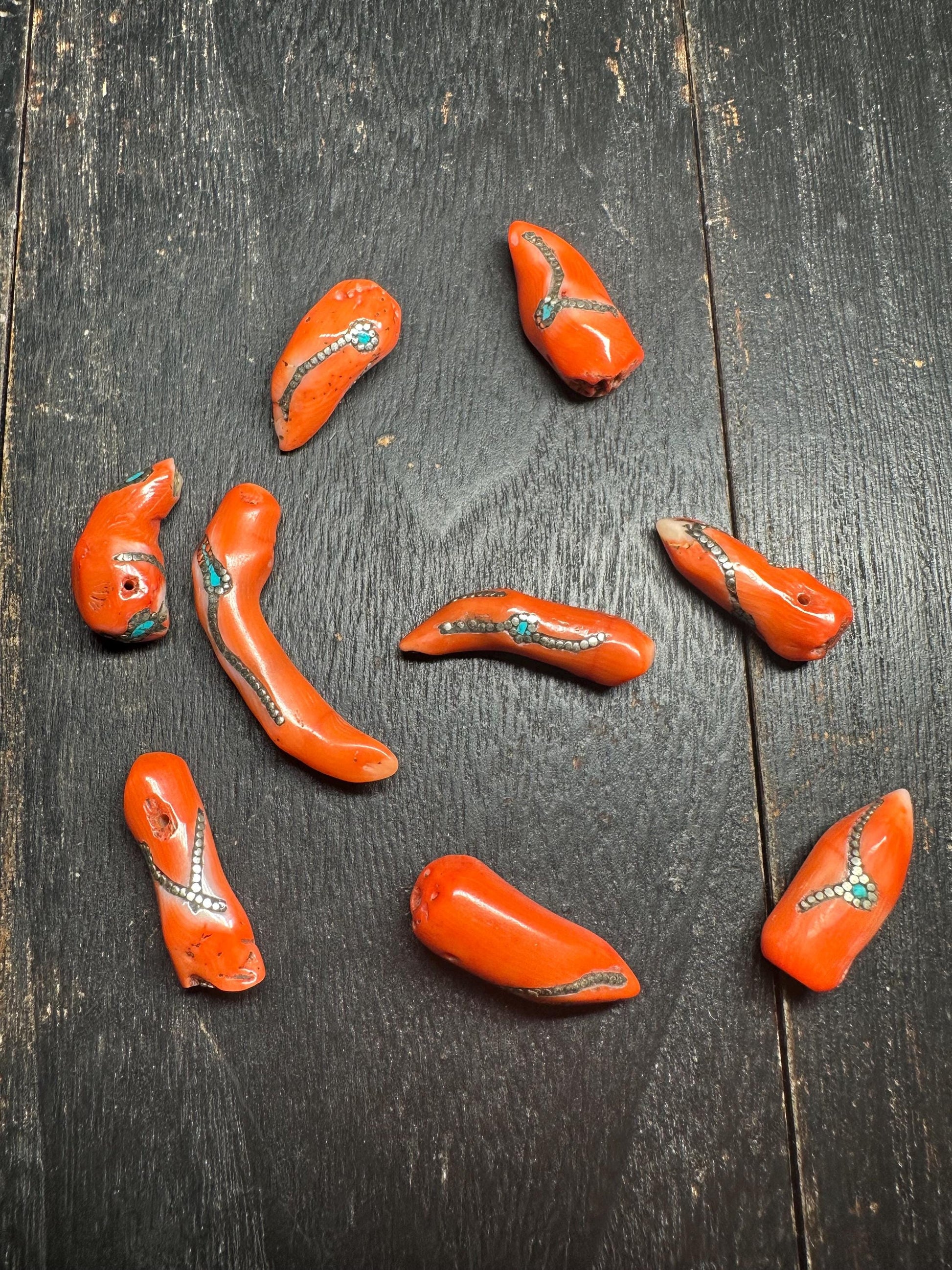 Elevate your style with this bohemian-inspired pendant featuring a natural red coral horn (or tusk) shape, beautifully inlaid with tiny turquoise beads and white-toned metal settings. Each pendant is unique in shape and color – selling 9 separate pieces from a single Etsy listing.