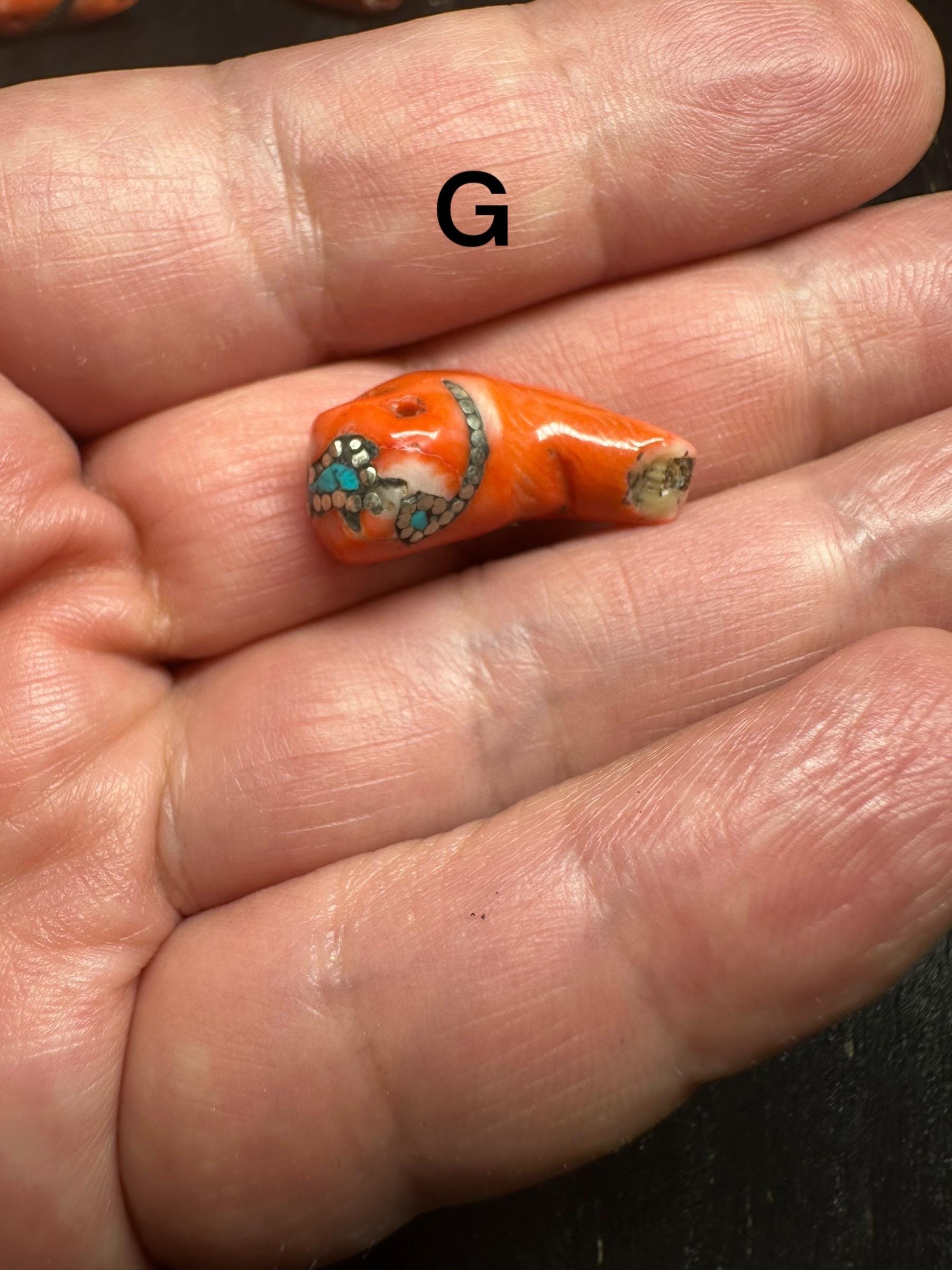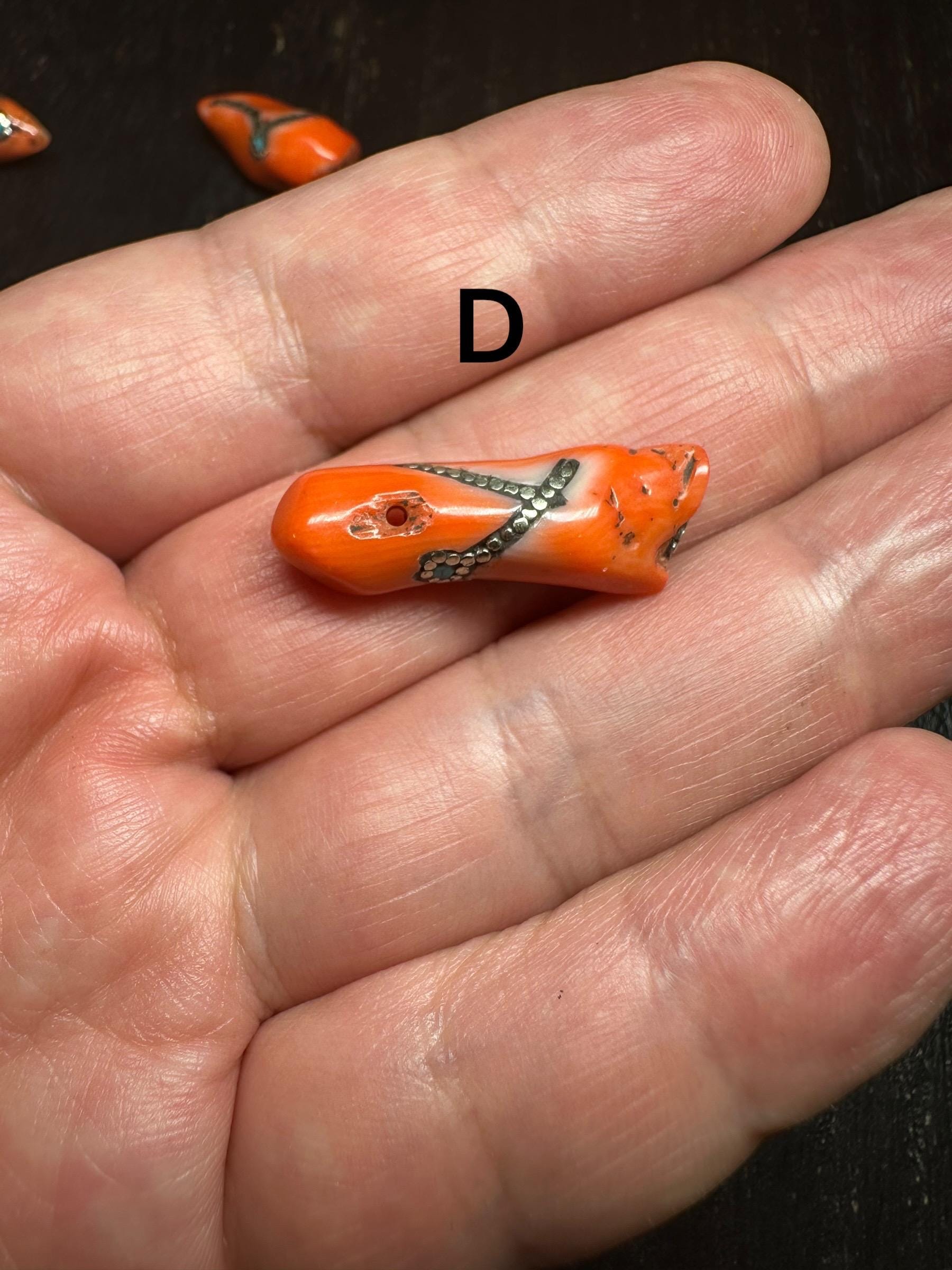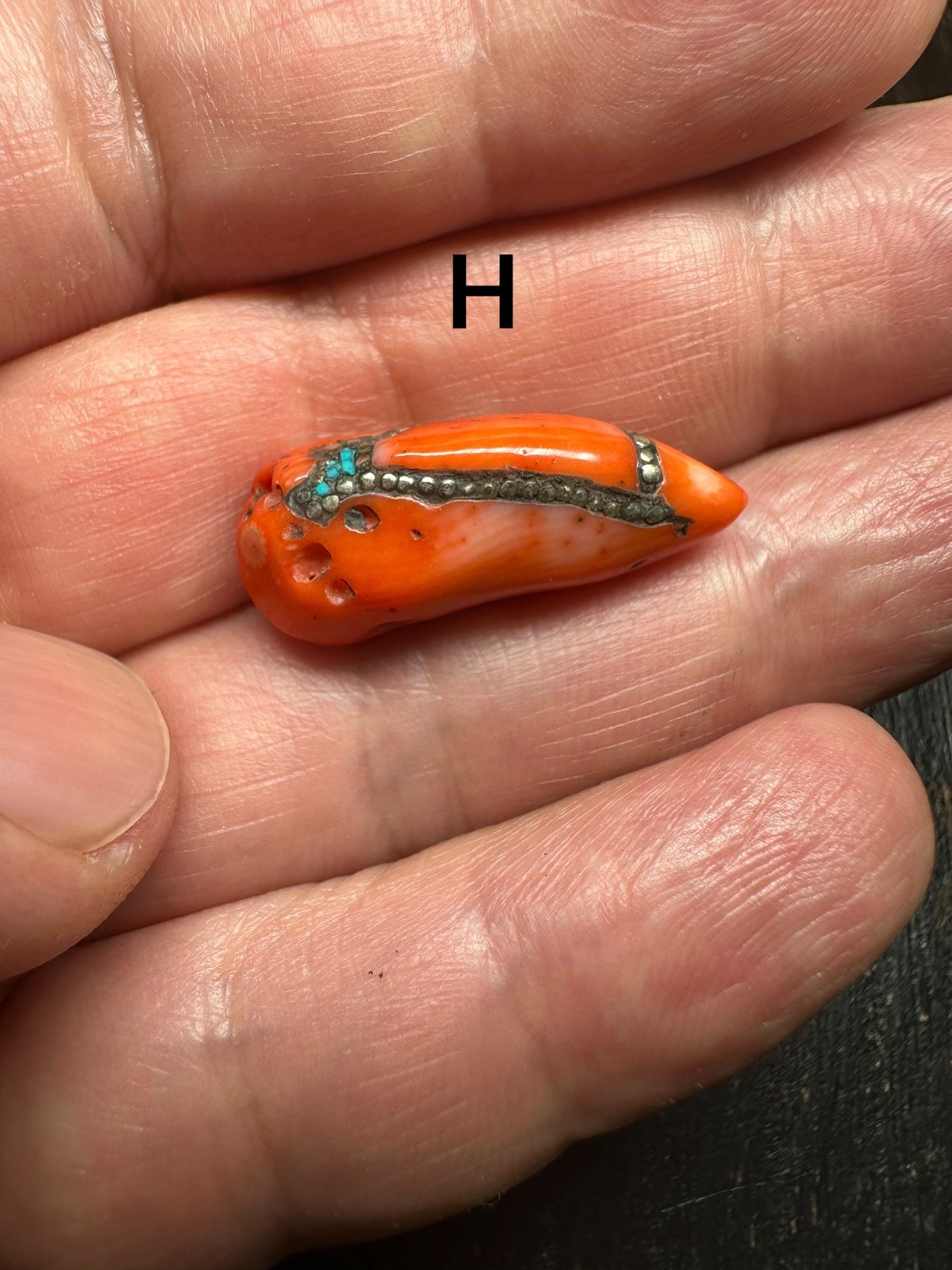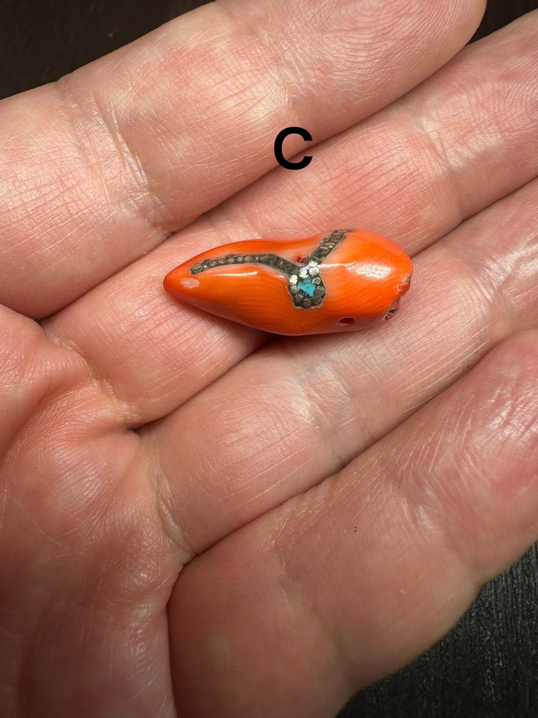 Elevate your style with this bohemian-inspired pendant featuring a natural red coral horn (or tusk) shape, beautifully inlaid with tiny turquoise beads and white-toned metal settings. Each pendant is unique in shape and color – selling 9 separate pieces from a single Etsy listing.