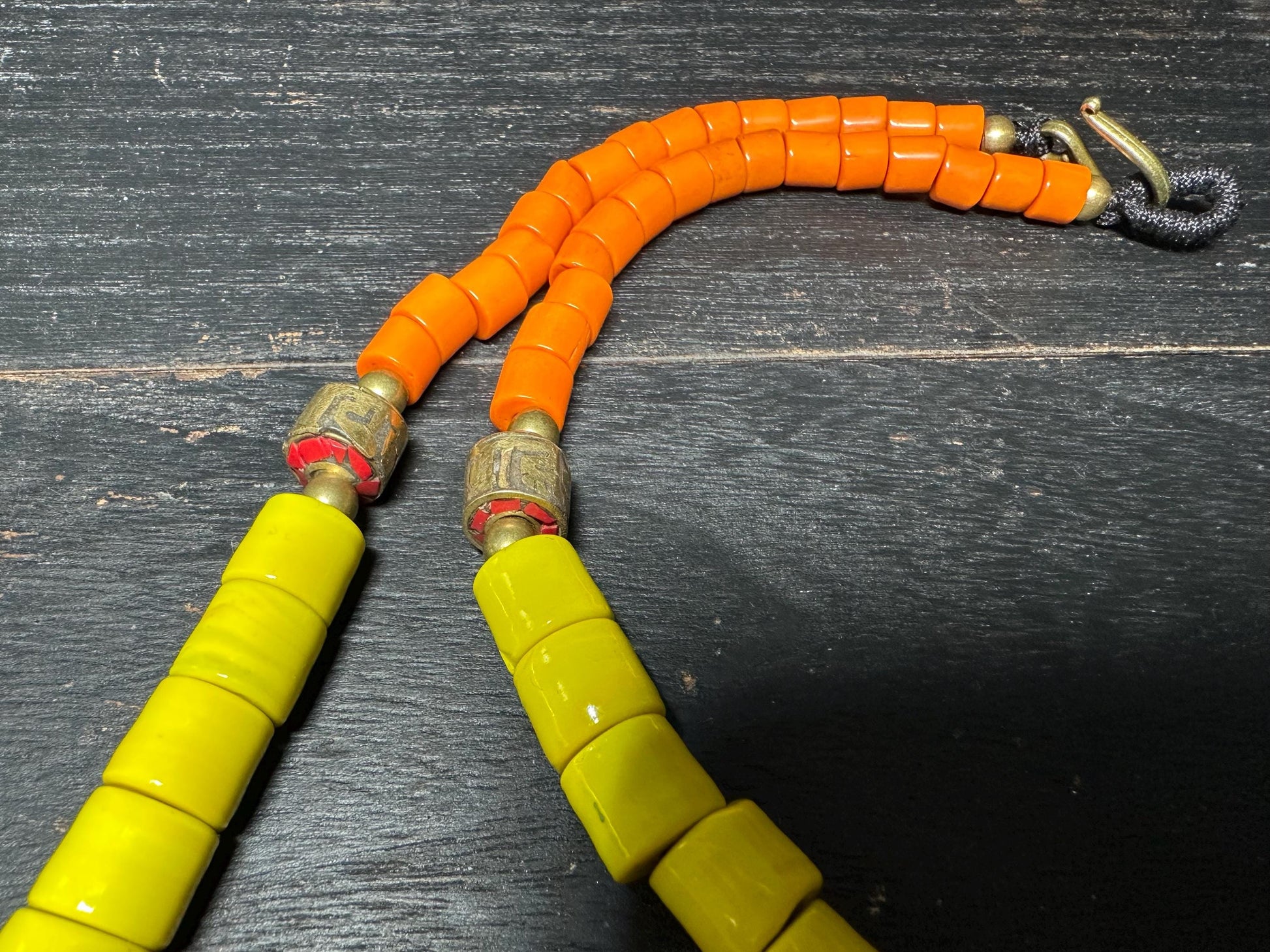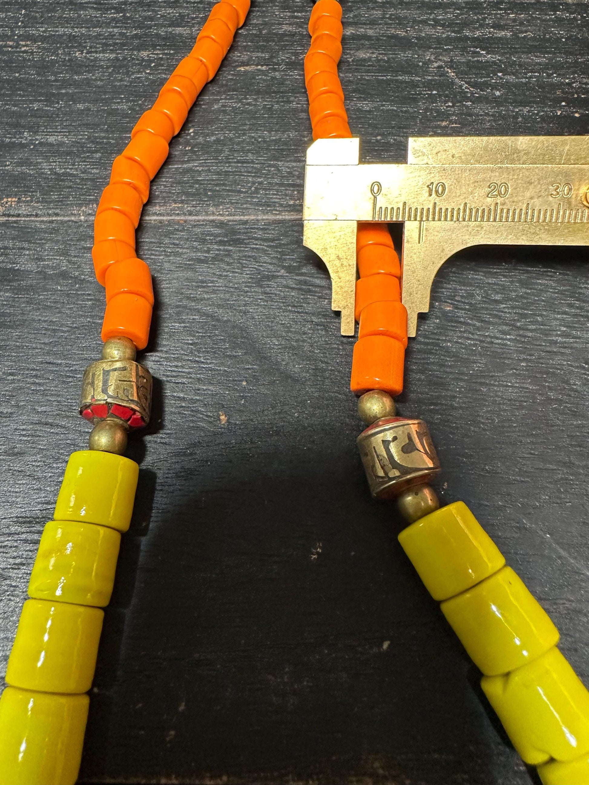 This stunning handmade necklace features a unique Tibetan tribal design. The centerpiece is a large crescent-shaped amulet pendant crafted from natural sea shell and accented with turquoise and coral inlays. The pendant is adorned with intricate brass work, showcasing traditional Tibetan craftsmanship. The necklace is further complemented by vibrant yellow and orange vintage glass beads, along with Tibetan brass spacer beads with etched symbols, adding to its ethnic charm.