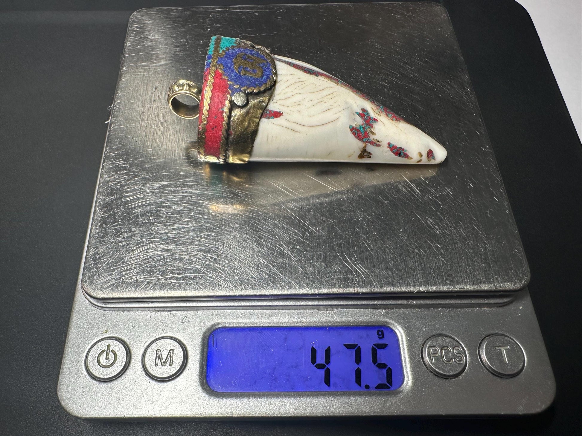 Though the specific provenance is unknown, its handcrafted beauty and striking design reflect traditional Nepalese and Tibetan artistry. A unique addition to any spiritual or tribal jewelry collection, this piece is perfect for those drawn to Himalayan culture, boho fashion, or symbolic amulets.