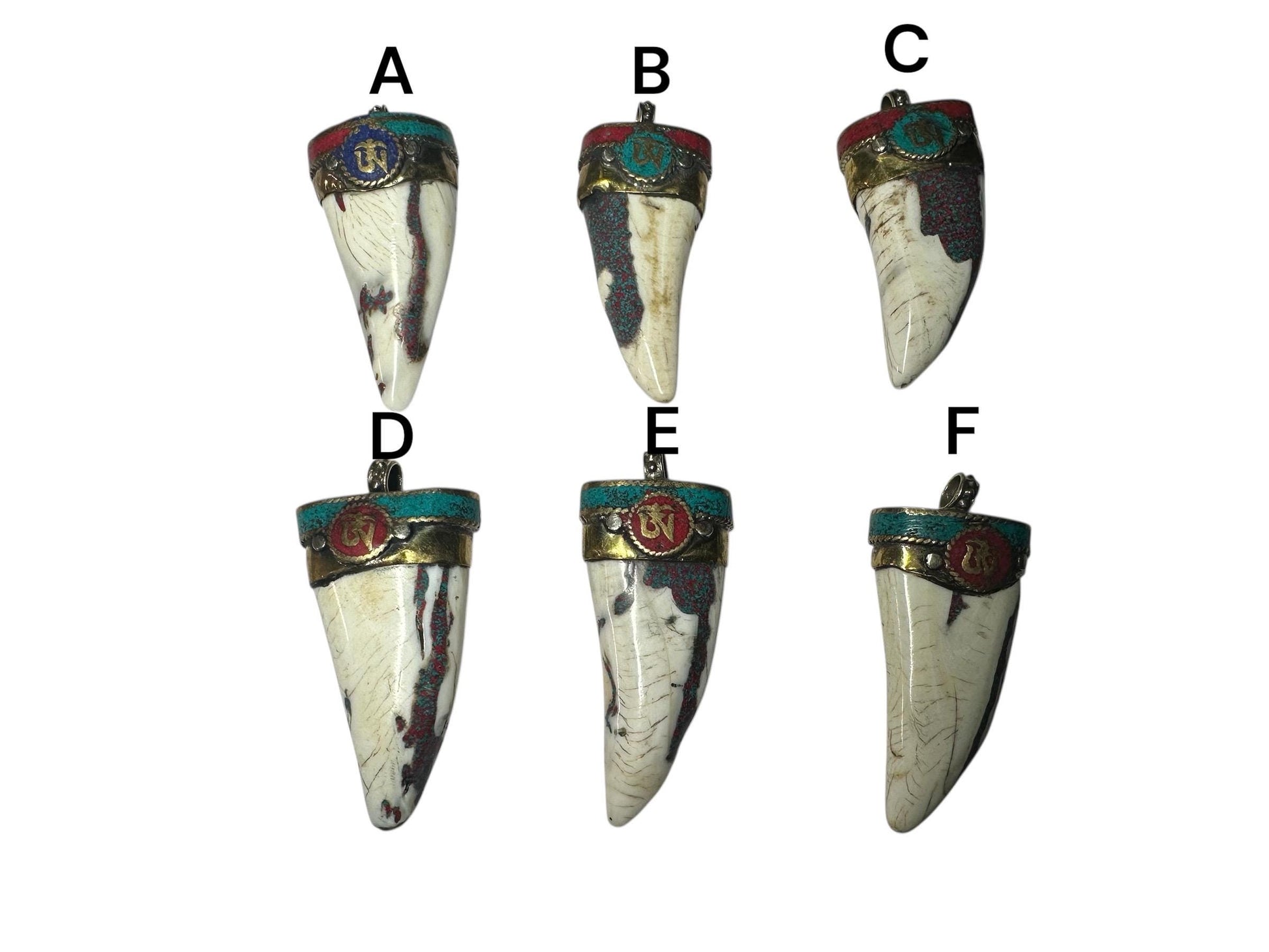 This stunning amulet pendant is a beautiful piece of ethnic Tibetan-inspired jewelry. Handmade in Nepal, it features a natural sea shell body carved in a horn or fang shape, accented with detailed brass metalwork and vibrant turquoise and red coral inlays. A prominent Tibetan Om (ༀ) symbol crowns the pendant, symbolizing spiritual awareness and cultural depth.