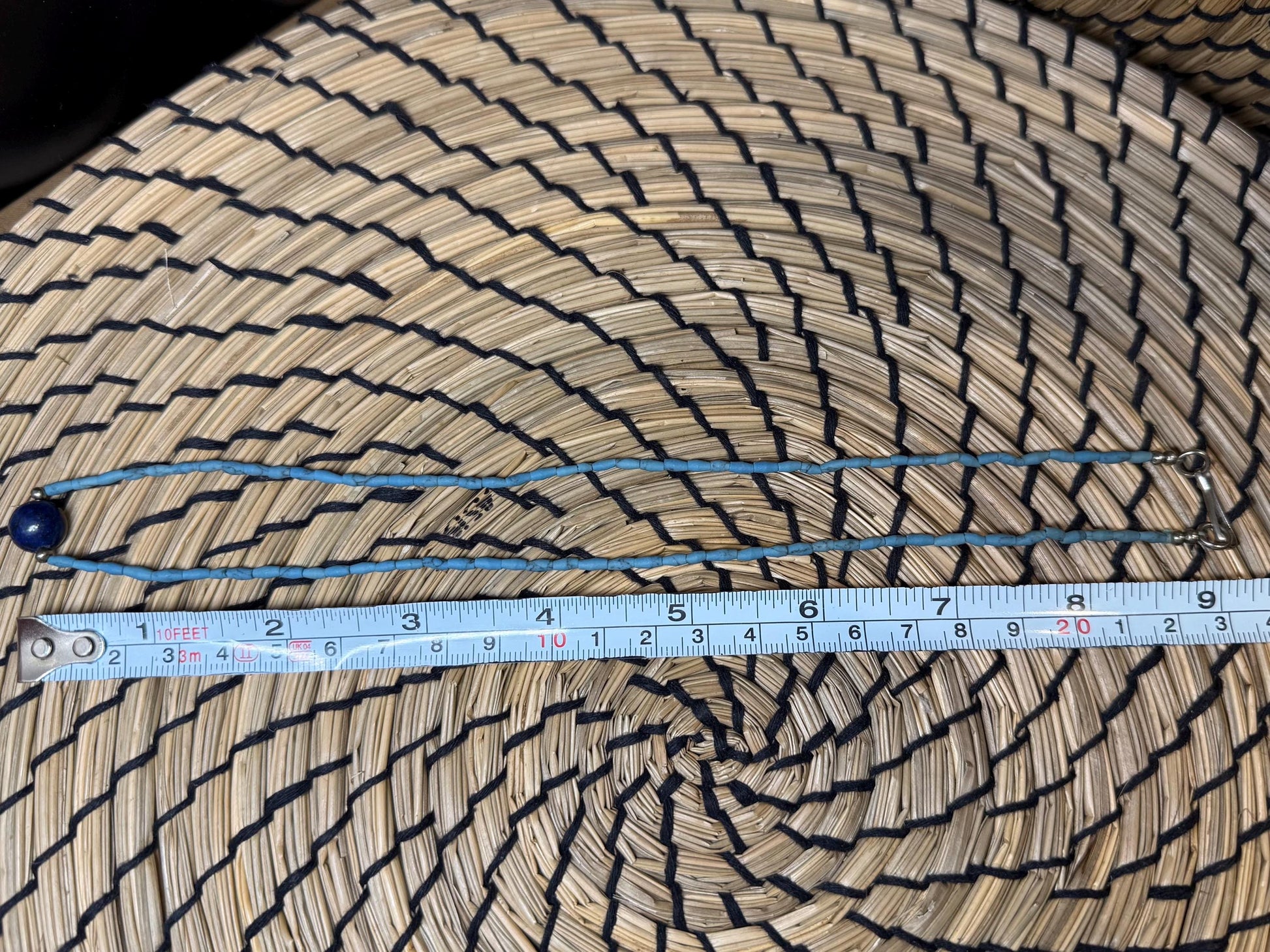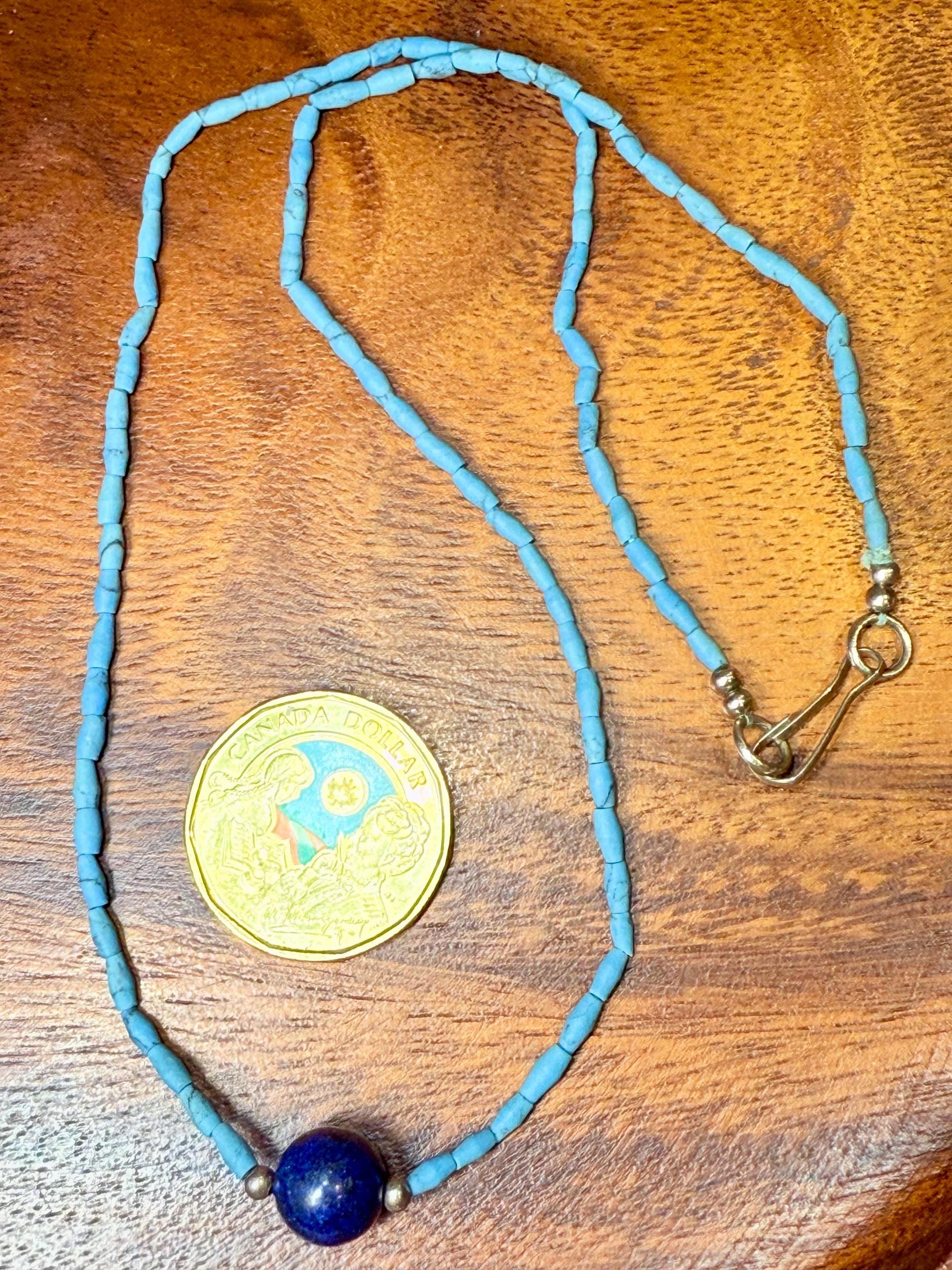 • Materials: Glass turquoise-colored beads, genuine Afghan lapis lazuli bead, metal accents