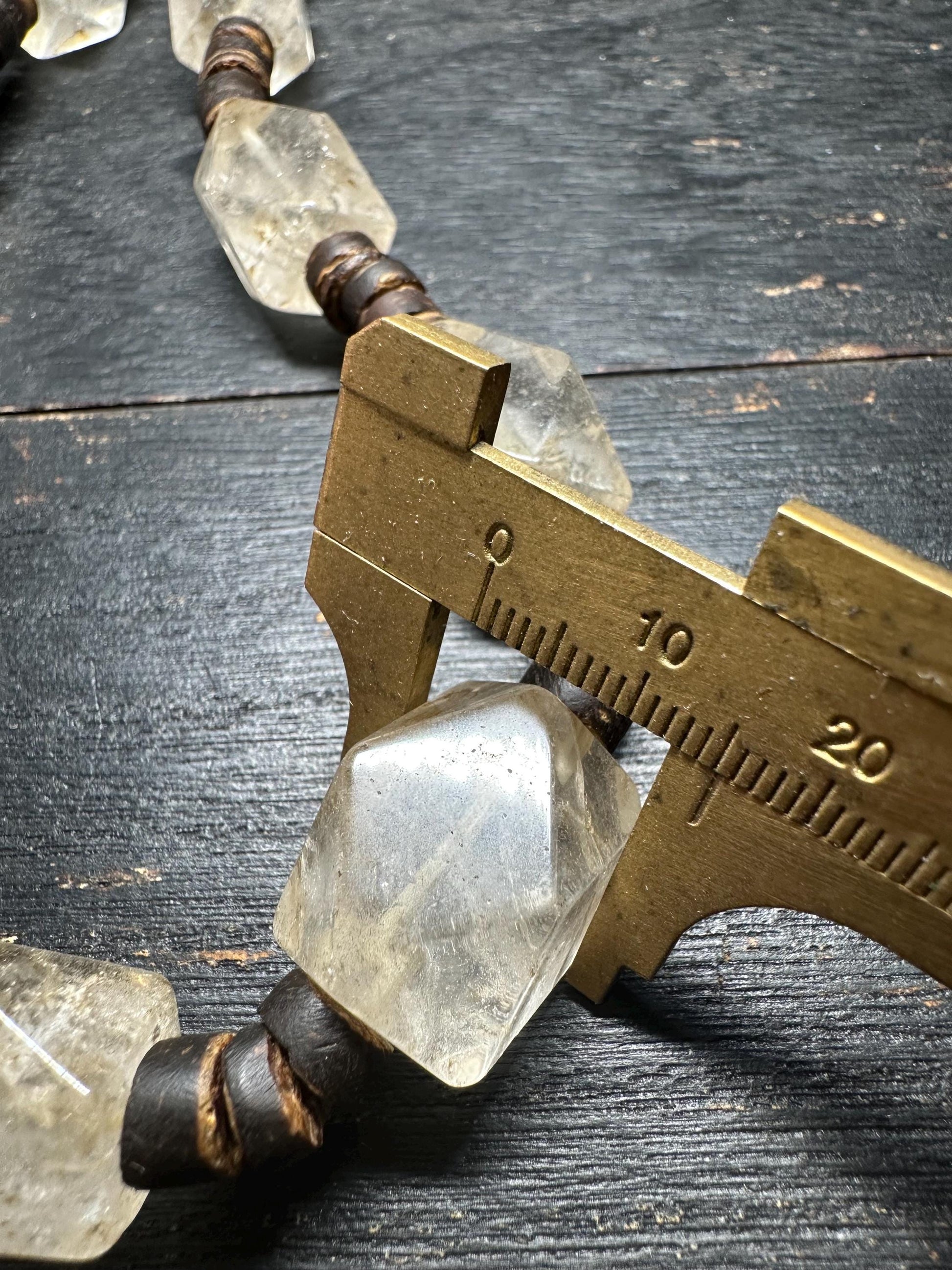 Unique handmade necklace featuring rare vintage rock crystal (quartz) beads combined with natural coconut shell spacers. These faceted old crystal beads originate from the Himalayan region, each one showcasing natural inclusions and age marks that add to their authentic character.