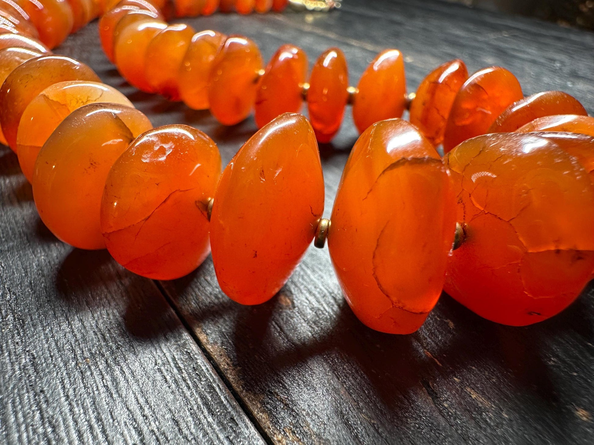 Each bead carries signs of age and history, giving this necklace a beautiful organic feel. The warm tones and natural inclusions make it a bold statement piece, perfect for collectors of tribal, Himalayan, or ethnographic jewelry.